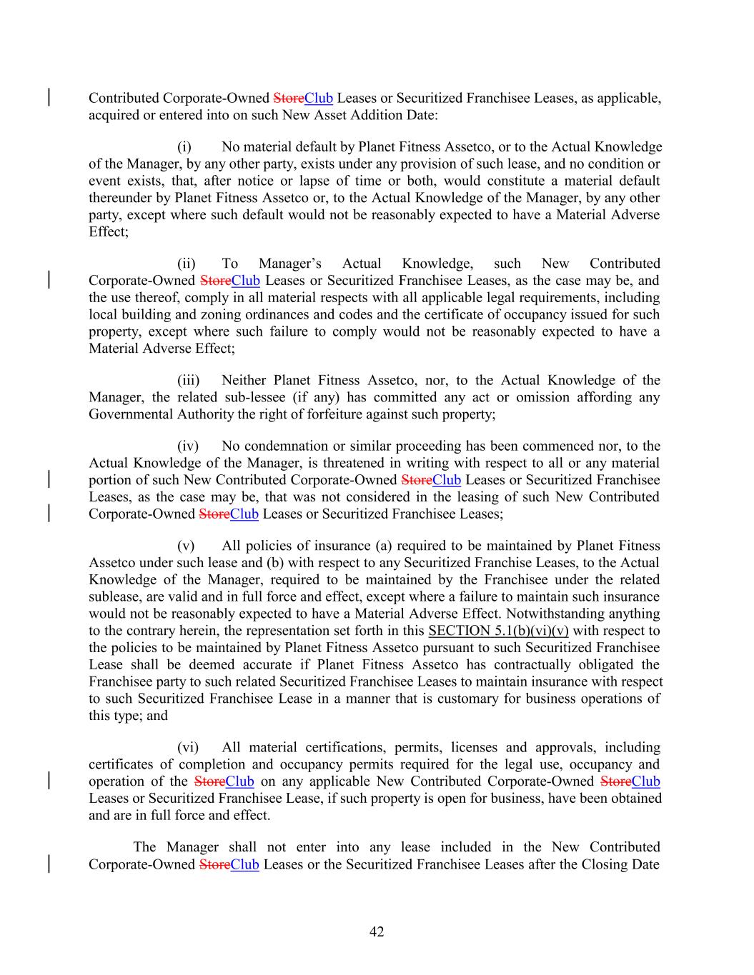 Contributed Corporate-Owned StoreClub Leases or Securitized Franchisee Leases, as applicable, acquired or entered into on such New Asset Addition Date: (i) No material default by Planet Fitness Assetco, or to the Actual Knowledge of the Manager, by any other party, exists under any provision of such lease, and no condition or event exists, that, after notice or lapse of time or both, would constitute a material default thereunder by Planet Fitness Assetco or, to the Actual Knowledge of the Manager, by any other party, except where such default would not be reasonably expected to have a Material Adverse Effect; (ii) To Manager’s Actual Knowledge, such New Contributed Corporate-Owned StoreClub Leases or Securitized Franchisee Leases, as the case may be, and the use thereof, comply in all material respects with all applicable legal requirements, including local building and zoning ordinances and codes and the certificate of occupancy issued for such property, except where such failure to comply would not be reasonably expected to have a Material Adverse Effect; (iii) Neither Planet Fitness Assetco, nor, to the Actual Knowledge of the Manager, the related sub-lessee (if any) has committed any act or omission affording any Governmental Authority the right of forfeiture against such property; (iv) No condemnation or similar proceeding has been commenced nor, to the Actual Knowledge of the Manager, is threatened in writing with respect to all or any material portion of such New Contributed Corporate-Owned StoreClub Leases or Securitized Franchisee Leases, as the case may be, that was not considered in the leasing of such New Contributed Corporate-Owned StoreClub Leases or Securitized Franchisee Leases; (v) All policies of insurance (a) required to be maintained by Planet Fitness Assetco under such lease and (b) with respect to any Securitized Franchise Leases, to the Actual Knowledge of the Manager, required to be maintained by the Franchisee under the related sublease, are valid and in full force and effect, except where a failure to maintain such insurance would not be reasonably expected to have a Material Adverse Effect. Notwithstanding anything to the contrary herein, the representation set forth in this SECTION 5.1(b)(vi)(v) with respect to the policies to be maintained by Planet Fitness Assetco pursuant to such Securitized Franchisee Lease shall be deemed accurate if Planet Fitness Assetco has contractually obligated the Franchisee party to such related Securitized Franchisee Leases to maintain insurance with respect to such Securitized Franchisee Lease in a manner that is customary for business operations of this type; and (vi) All material certifications, permits, licenses and approvals, including certificates of completion and occupancy permits required for the legal use, occupancy and operation of the StoreClub on any applicable New Contributed Corporate-Owned StoreClub Leases or Securitized Franchisee Lease, if such property is open for business, have been obtained and are in full force and effect. The Manager shall not enter into any lease included in the New Contributed Corporate-Owned StoreClub Leases or the Securitized Franchisee Leases after the Closing Date 42