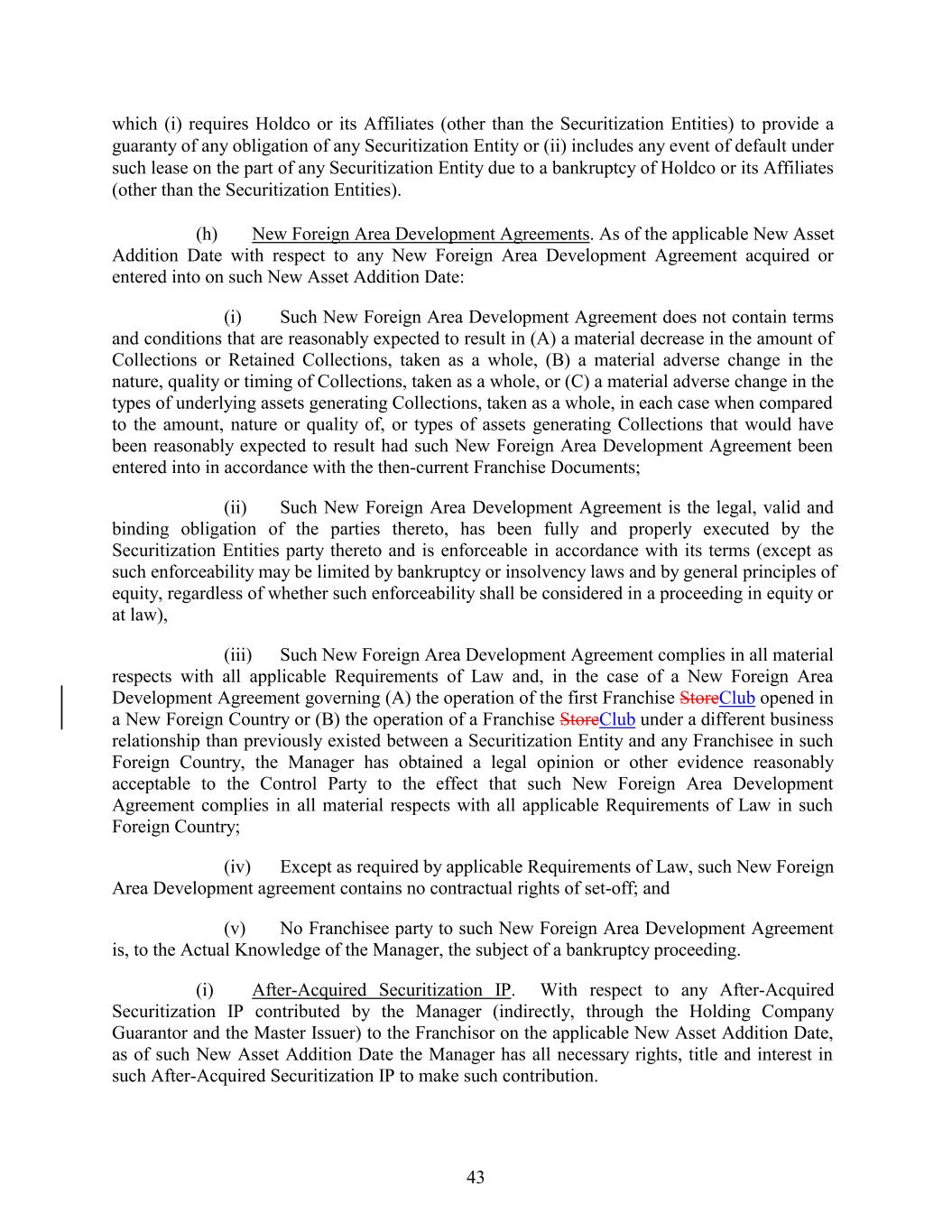 which (i) requires Holdco or its Affiliates (other than the Securitization Entities) to provide a guaranty of any obligation of any Securitization Entity or (ii) includes any event of default under such lease on the part of any Securitization Entity due to a bankruptcy of Holdco or its Affiliates (other than the Securitization Entities). (h) New Foreign Area Development Agreements. As of the applicable New Asset Addition Date with respect to any New Foreign Area Development Agreement acquired or entered into on such New Asset Addition Date: (i) Such New Foreign Area Development Agreement does not contain terms and conditions that are reasonably expected to result in (A) a material decrease in the amount of Collections or Retained Collections, taken as a whole, (B) a material adverse change in the nature, quality or timing of Collections, taken as a whole, or (C) a material adverse change in the types of underlying assets generating Collections, taken as a whole, in each case when compared to the amount, nature or quality of, or types of assets generating Collections that would have been reasonably expected to result had such New Foreign Area Development Agreement been entered into in accordance with the then-current Franchise Documents; (ii) Such New Foreign Area Development Agreement is the legal, valid and binding obligation of the parties thereto, has been fully and properly executed by the Securitization Entities party thereto and is enforceable in accordance with its terms (except as such enforceability may be limited by bankruptcy or insolvency laws and by general principles of equity, regardless of whether such enforceability shall be considered in a proceeding in equity or at law), (iii) Such New Foreign Area Development Agreement complies in all material respects with all applicable Requirements of Law and, in the case of a New Foreign Area Development Agreement governing (A) the operation of the first Franchise StoreClub opened in a New Foreign Country or (B) the operation of a Franchise StoreClub under a different business relationship than previously existed between a Securitization Entity and any Franchisee in such Foreign Country, the Manager has obtained a legal opinion or other evidence reasonably acceptable to the Control Party to the effect that such New Foreign Area Development Agreement complies in all material respects with all applicable Requirements of Law in such Foreign Country; (iv) Except as required by applicable Requirements of Law, such New Foreign Area Development agreement contains no contractual rights of set-off; and (v) No Franchisee party to such New Foreign Area Development Agreement is, to the Actual Knowledge of the Manager, the subject of a bankruptcy proceeding. (i) After-Acquired Securitization IP. With respect to any After-Acquired Securitization IP contributed by the Manager (indirectly, through the Holding Company Guarantor and the Master Issuer) to the Franchisor on the applicable New Asset Addition Date, as of such New Asset Addition Date the Manager has all necessary rights, title and interest in such After-Acquired Securitization IP to make such contribution. 43