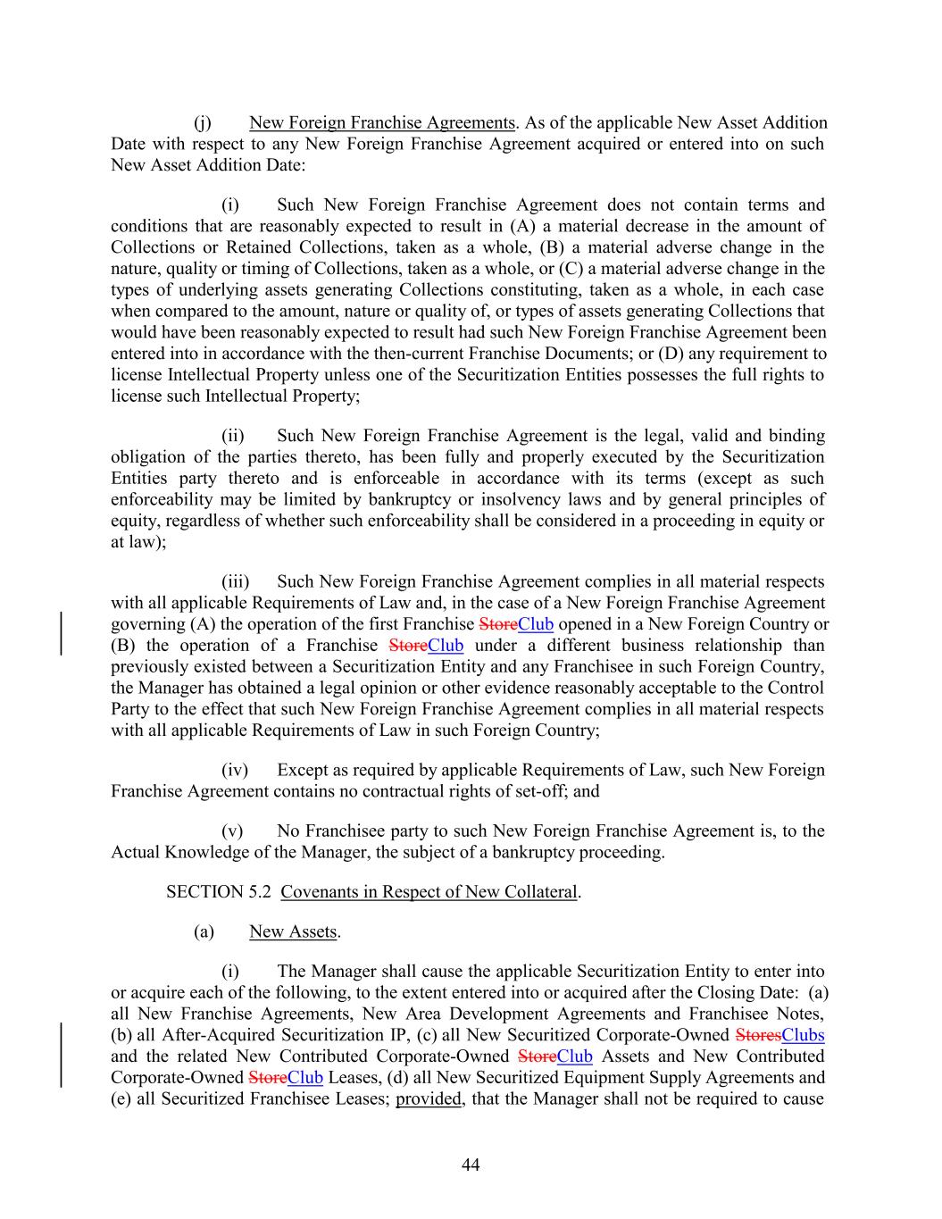 (j) New Foreign Franchise Agreements. As of the applicable New Asset Addition Date with respect to any New Foreign Franchise Agreement acquired or entered into on such New Asset Addition Date: (i) Such New Foreign Franchise Agreement does not contain terms and conditions that are reasonably expected to result in (A) a material decrease in the amount of Collections or Retained Collections, taken as a whole, (B) a material adverse change in the nature, quality or timing of Collections, taken as a whole, or (C) a material adverse change in the types of underlying assets generating Collections constituting, taken as a whole, in each case when compared to the amount, nature or quality of, or types of assets generating Collections that would have been reasonably expected to result had such New Foreign Franchise Agreement been entered into in accordance with the then-current Franchise Documents; or (D) any requirement to license Intellectual Property unless one of the Securitization Entities possesses the full rights to license such Intellectual Property; (ii) Such New Foreign Franchise Agreement is the legal, valid and binding obligation of the parties thereto, has been fully and properly executed by the Securitization Entities party thereto and is enforceable in accordance with its terms (except as such enforceability may be limited by bankruptcy or insolvency laws and by general principles of equity, regardless of whether such enforceability shall be considered in a proceeding in equity or at law); (iii) Such New Foreign Franchise Agreement complies in all material respects with all applicable Requirements of Law and, in the case of a New Foreign Franchise Agreement governing (A) the operation of the first Franchise StoreClub opened in a New Foreign Country or (B) the operation of a Franchise StoreClub under a different business relationship than previously existed between a Securitization Entity and any Franchisee in such Foreign Country, the Manager has obtained a legal opinion or other evidence reasonably acceptable to the Control Party to the effect that such New Foreign Franchise Agreement complies in all material respects with all applicable Requirements of Law in such Foreign Country; (iv) Except as required by applicable Requirements of Law, such New Foreign Franchise Agreement contains no contractual rights of set-off; and (v) No Franchisee party to such New Foreign Franchise Agreement is, to the Actual Knowledge of the Manager, the subject of a bankruptcy proceeding. SECTION 5.2 Covenants in Respect of New Collateral. (a) New Assets. (i) The Manager shall cause the applicable Securitization Entity to enter into or acquire each of the following, to the extent entered into or acquired after the Closing Date: (a) all New Franchise Agreements, New Area Development Agreements and Franchisee Notes, (b) all After-Acquired Securitization IP, (c) all New Securitized Corporate-Owned StoresClubs and the related New Contributed Corporate-Owned StoreClub Assets and New Contributed Corporate-Owned StoreClub Leases, (d) all New Securitized Equipment Supply Agreements and (e) all Securitized Franchisee Leases; provided, that the Manager shall not be required to cause 44
