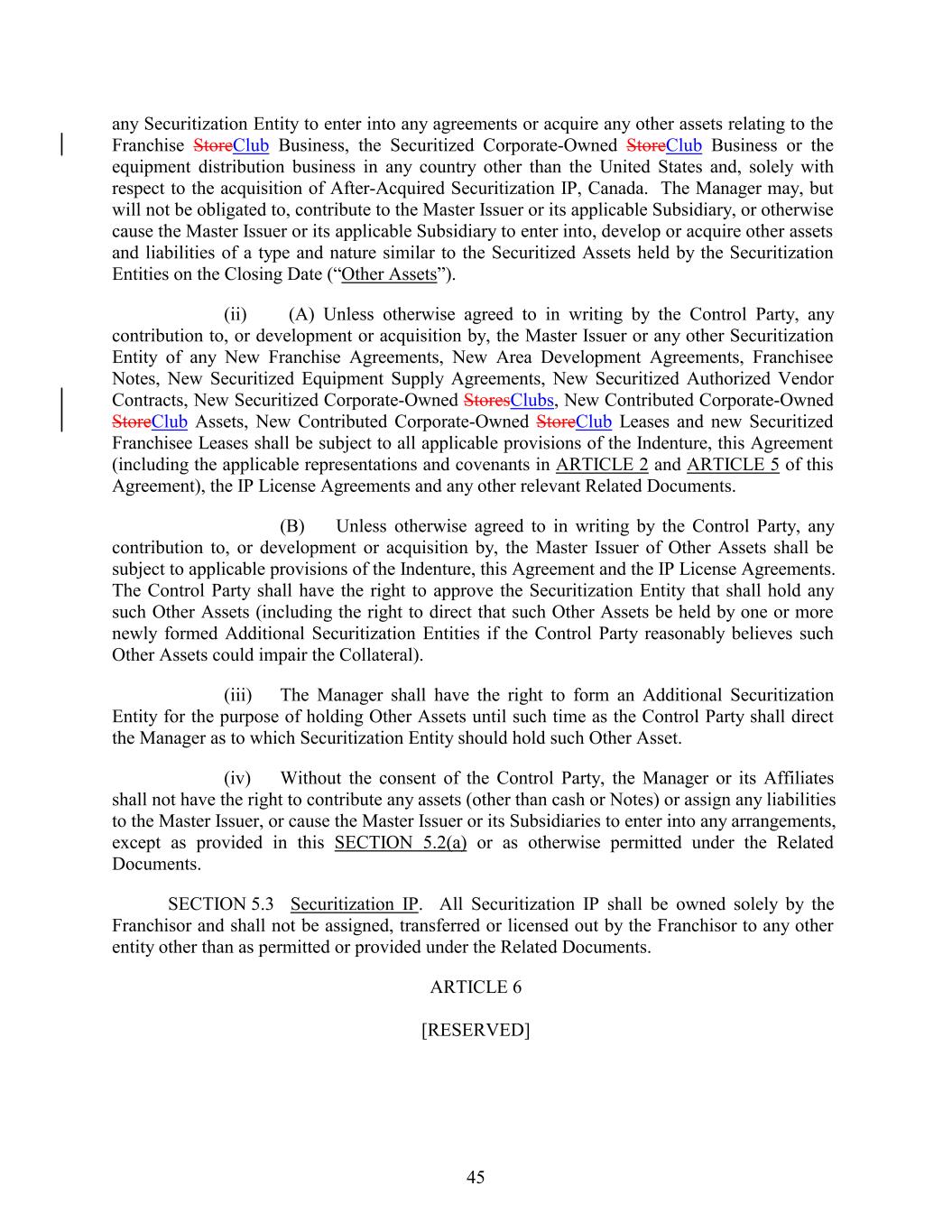 any Securitization Entity to enter into any agreements or acquire any other assets relating to the Franchise StoreClub Business, the Securitized Corporate-Owned StoreClub Business or the equipment distribution business in any country other than the United States and, solely with respect to the acquisition of After-Acquired Securitization IP, Canada. The Manager may, but will not be obligated to, contribute to the Master Issuer or its applicable Subsidiary, or otherwise cause the Master Issuer or its applicable Subsidiary to enter into, develop or acquire other assets and liabilities of a type and nature similar to the Securitized Assets held by the Securitization Entities on the Closing Date (“Other Assets”). (ii) (A) Unless otherwise agreed to in writing by the Control Party, any contribution to, or development or acquisition by, the Master Issuer or any other Securitization Entity of any New Franchise Agreements, New Area Development Agreements, Franchisee Notes, New Securitized Equipment Supply Agreements, New Securitized Authorized Vendor Contracts, New Securitized Corporate-Owned StoresClubs, New Contributed Corporate-Owned StoreClub Assets, New Contributed Corporate-Owned StoreClub Leases and new Securitized Franchisee Leases shall be subject to all applicable provisions of the Indenture, this Agreement (including the applicable representations and covenants in ARTICLE 2 and ARTICLE 5 of this Agreement), the IP License Agreements and any other relevant Related Documents. (B) Unless otherwise agreed to in writing by the Control Party, any contribution to, or development or acquisition by, the Master Issuer of Other Assets shall be subject to applicable provisions of the Indenture, this Agreement and the IP License Agreements. The Control Party shall have the right to approve the Securitization Entity that shall hold any such Other Assets (including the right to direct that such Other Assets be held by one or more newly formed Additional Securitization Entities if the Control Party reasonably believes such Other Assets could impair the Collateral). (iii) The Manager shall have the right to form an Additional Securitization Entity for the purpose of holding Other Assets until such time as the Control Party shall direct the Manager as to which Securitization Entity should hold such Other Asset. (iv) Without the consent of the Control Party, the Manager or its Affiliates shall not have the right to contribute any assets (other than cash or Notes) or assign any liabilities to the Master Issuer, or cause the Master Issuer or its Subsidiaries to enter into any arrangements, except as provided in this SECTION 5.2(a) or as otherwise permitted under the Related Documents. SECTION 5.3 Securitization IP. All Securitization IP shall be owned solely by the Franchisor and shall not be assigned, transferred or licensed out by the Franchisor to any other entity other than as permitted or provided under the Related Documents. ARTICLE 6 [RESERVED] 45