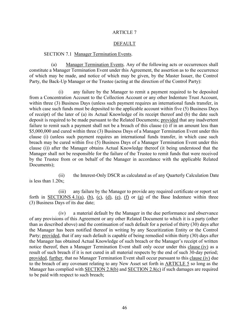 ARTICLE 7 DEFAULT SECTION 7.1 Manager Termination Events. (a) Manager Termination Events. Any of the following acts or occurrences shall constitute a Manager Termination Event under this Agreement, the assertion as to the occurrence of which may be made, and notice of which may be given, by the Master Issuer, the Control Party, the Back-Up Manager or the Trustee (acting at the direction of the Control Party): (i) any failure by the Manager to remit a payment required to be deposited from a Concentration Account to the Collection Account or any other Indenture Trust Account, within three (3) Business Days (unless such payment requires an international funds transfer, in which case such funds must be deposited to the applicable account within five (5) Business Days of receipt) of the later of (a) its Actual Knowledge of its receipt thereof and (b) the date such deposit is required to be made pursuant to the Related Documents; provided that any inadvertent failure to remit such a payment shall not be a breach of this clause (i) if in an amount less than $5,000,000 and cured within three (3) Business Days of a Manager Termination Event under this clause (i) (unless such payment requires an international funds transfer, in which case such breach may be cured within five (5) Business Days of a Manager Termination Event under this clause (i)) after the Manager obtains Actual Knowledge thereof (it being understood that the Manager shall not be responsible for the failure of the Trustee to remit funds that were received by the Trustee from or on behalf of the Manager in accordance with the applicable Related Documents); (ii) the Interest-Only DSCR as calculated as of any Quarterly Calculation Date is less than 1.20x; (iii) any failure by the Manager to provide any required certificate or report set forth in SECTIONS 4.1(a), (b), (c), (d), (e), (f) or (g) of the Base Indenture within three (3) Business Days of its due date; (iv) a material default by the Manager in the due performance and observance of any provisions of this Agreement or any other Related Document to which it is a party (other than as described above) and the continuation of such default for a period of thirty (30) days after the Manager has been notified thereof in writing by any Securitization Entity or the Control Party; provided, that if any such default is capable of being remedied within thirty (30) days after the Manager has obtained Actual Knowledge of such breach or the Manager’s receipt of written notice thereof, then a Manager Termination Event shall only occur under this clause (iv) as a result of such breach if it is not cured in all material respects by the end of such 30-day period; provided, further, that no Manager Termination Event shall occur pursuant to this clause (iv) due to the breach of any covenant relating to any New Asset set forth in ARTICLE 5 so long as the Manager has complied with SECTION 2.8(b) and SECTION 2.8(c) if such damages are required to be paid with respect to such breach; 46