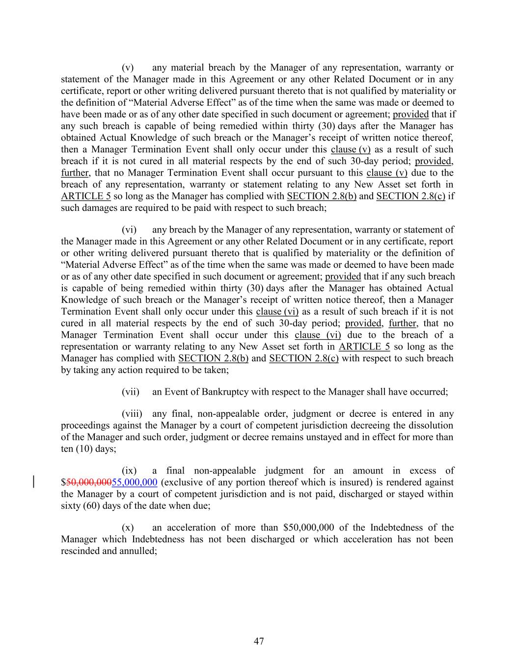 (v) any material breach by the Manager of any representation, warranty or statement of the Manager made in this Agreement or any other Related Document or in any certificate, report or other writing delivered pursuant thereto that is not qualified by materiality or the definition of “Material Adverse Effect” as of the time when the same was made or deemed to have been made or as of any other date specified in such document or agreement; provided that if any such breach is capable of being remedied within thirty (30) days after the Manager has obtained Actual Knowledge of such breach or the Manager’s receipt of written notice thereof, then a Manager Termination Event shall only occur under this clause (v) as a result of such breach if it is not cured in all material respects by the end of such 30-day period; provided, further, that no Manager Termination Event shall occur pursuant to this clause (v) due to the breach of any representation, warranty or statement relating to any New Asset set forth in ARTICLE 5 so long as the Manager has complied with SECTION 2.8(b) and SECTION 2.8(c) if such damages are required to be paid with respect to such breach; (vi) any breach by the Manager of any representation, warranty or statement of the Manager made in this Agreement or any other Related Document or in any certificate, report or other writing delivered pursuant thereto that is qualified by materiality or the definition of “Material Adverse Effect” as of the time when the same was made or deemed to have been made or as of any other date specified in such document or agreement; provided that if any such breach is capable of being remedied within thirty (30) days after the Manager has obtained Actual Knowledge of such breach or the Manager’s receipt of written notice thereof, then a Manager Termination Event shall only occur under this clause (vi) as a result of such breach if it is not cured in all material respects by the end of such 30-day period; provided, further, that no Manager Termination Event shall occur under this clause (vi) due to the breach of a representation or warranty relating to any New Asset set forth in ARTICLE 5 so long as the Manager has complied with SECTION 2.8(b) and SECTION 2.8(c) with respect to such breach by taking any action required to be taken; (vii) an Event of Bankruptcy with respect to the Manager shall have occurred; (viii) any final, non-appealable order, judgment or decree is entered in any proceedings against the Manager by a court of competent jurisdiction decreeing the dissolution of the Manager and such order, judgment or decree remains unstayed and in effect for more than ten (10) days; (ix) a final non-appealable judgment for an amount in excess of $50,000,00055,000,000 (exclusive of any portion thereof which is insured) is rendered against the Manager by a court of competent jurisdiction and is not paid, discharged or stayed within sixty (60) days of the date when due; (x) an acceleration of more than $50,000,000 of the Indebtedness of the Manager which Indebtedness has not been discharged or which acceleration has not been rescinded and annulled; 47