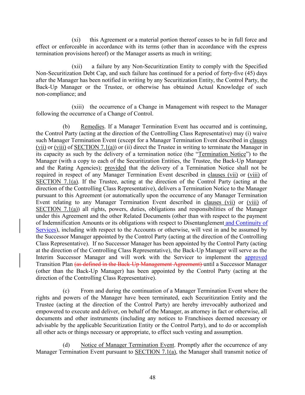 (xi) this Agreement or a material portion thereof ceases to be in full force and effect or enforceable in accordance with its terms (other than in accordance with the express termination provisions hereof) or the Manager asserts as much in writing; (xii) a failure by any Non-Securitization Entity to comply with the Specified Non-Securitization Debt Cap, and such failure has continued for a period of forty-five (45) days after the Manager has been notified in writing by any Securitization Entity, the Control Party, the Back-Up Manager or the Trustee, or otherwise has obtained Actual Knowledge of such non-compliance; and (xiii) the occurrence of a Change in Management with respect to the Manager following the occurrence of a Change of Control. (b) Remedies. If a Manager Termination Event has occurred and is continuing, the Control Party (acting at the direction of the Controlling Class Representative) may (i) waive such Manager Termination Event (except for a Manager Termination Event described in clauses (vii) or (viii) of SECTION 7.1(a)) or (ii) direct the Trustee in writing to terminate the Manager in its capacity as such by the delivery of a termination notice (the “Termination Notice”) to the Manager (with a copy to each of the Securitization Entities, the Trustee, the Back-Up Manager and the Rating Agencies); provided that the delivery of a Termination Notice shall not be required in respect of any Manager Termination Event described in clauses (vii) or (viii) of SECTION 7.1(a). If the Trustee, acting at the direction of the Control Party (acting at the direction of the Controlling Class Representative), delivers a Termination Notice to the Manager pursuant to this Agreement (or automatically upon the occurrence of any Manager Termination Event relating to any Manager Termination Event described in clauses (vii) or (viii) of SECTION 7.1(a)) all rights, powers, duties, obligations and responsibilities of the Manager under this Agreement and the other Related Documents (other than with respect to the payment of Indemnification Amounts or its obligations with respect to Disentanglement and Continuity of Services), including with respect to the Accounts or otherwise, will vest in and be assumed by the Successor Manager appointed by the Control Party (acting at the direction of the Controlling Class Representative). If no Successor Manager has been appointed by the Control Party (acting at the direction of the Controlling Class Representative), the Back-Up Manager will serve as the Interim Successor Manager and will work with the Servicer to implement the approved Transition Plan (as defined in the Back-Up Management Agreement) until a Successor Manager (other than the Back-Up Manager) has been appointed by the Control Party (acting at the direction of the Controlling Class Representative). (c) From and during the continuation of a Manager Termination Event where the rights and powers of the Manager have been terminated, each Securitization Entity and the Trustee (acting at the direction of the Control Party) are hereby irrevocably authorized and empowered to execute and deliver, on behalf of the Manager, as attorney in fact or otherwise, all documents and other instruments (including any notices to Franchisees deemed necessary or advisable by the applicable Securitization Entity or the Control Party), and to do or accomplish all other acts or things necessary or appropriate, to effect such vesting and assumption. (d) Notice of Manager Termination Event. Promptly after the occurrence of any Manager Termination Event pursuant to SECTION 7.1(a), the Manager shall transmit notice of 48