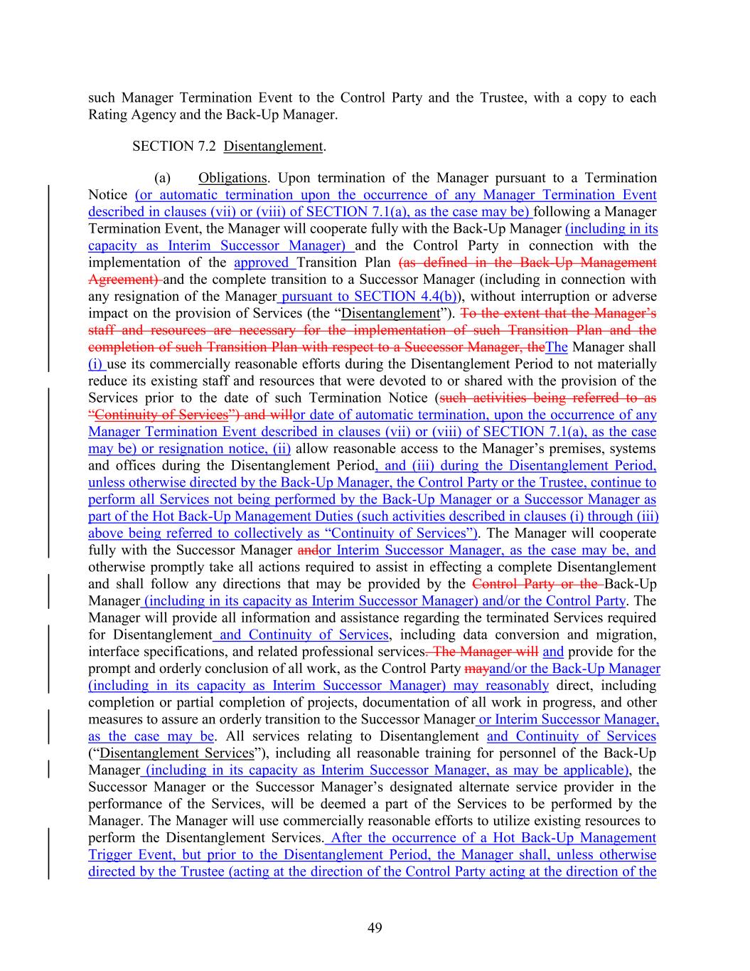 such Manager Termination Event to the Control Party and the Trustee, with a copy to each Rating Agency and the Back-Up Manager. SECTION 7.2 Disentanglement. (a) Obligations. Upon termination of the Manager pursuant to a Termination Notice (or automatic termination upon the occurrence of any Manager Termination Event described in clauses (vii) or (viii) of SECTION 7.1(a), as the case may be) following a Manager Termination Event, the Manager will cooperate fully with the Back-Up Manager (including in its capacity as Interim Successor Manager) and the Control Party in connection with the implementation of the approved Transition Plan (as defined in the Back-Up Management Agreement) and the complete transition to a Successor Manager (including in connection with any resignation of the Manager pursuant to SECTION 4.4(b)), without interruption or adverse impact on the provision of Services (the “Disentanglement”). To the extent that the Manager’s staff and resources are necessary for the implementation of such Transition Plan and the completion of such Transition Plan with respect to a Successor Manager, theThe Manager shall (i) use its commercially reasonable efforts during the Disentanglement Period to not materially reduce its existing staff and resources that were devoted to or shared with the provision of the Services prior to the date of such Termination Notice (such activities being referred to as “Continuity of Services”) and willor date of automatic termination, upon the occurrence of any Manager Termination Event described in clauses (vii) or (viii) of SECTION 7.1(a), as the case may be) or resignation notice, (ii) allow reasonable access to the Manager’s premises, systems and offices during the Disentanglement Period, and (iii) during the Disentanglement Period, unless otherwise directed by the Back-Up Manager, the Control Party or the Trustee, continue to perform all Services not being performed by the Back-Up Manager or a Successor Manager as part of the Hot Back-Up Management Duties (such activities described in clauses (i) through (iii) above being referred to collectively as “Continuity of Services”). The Manager will cooperate fully with the Successor Manager andor Interim Successor Manager, as the case may be, and otherwise promptly take all actions required to assist in effecting a complete Disentanglement and shall follow any directions that may be provided by the Control Party or the Back-Up Manager (including in its capacity as Interim Successor Manager) and/or the Control Party. The Manager will provide all information and assistance regarding the terminated Services required for Disentanglement and Continuity of Services, including data conversion and migration, interface specifications, and related professional services. The Manager will and provide for the prompt and orderly conclusion of all work, as the Control Party mayand/or the Back-Up Manager (including in its capacity as Interim Successor Manager) may reasonably direct, including completion or partial completion of projects, documentation of all work in progress, and other measures to assure an orderly transition to the Successor Manager or Interim Successor Manager, as the case may be. All services relating to Disentanglement and Continuity of Services (“Disentanglement Services”), including all reasonable training for personnel of the Back-Up Manager (including in its capacity as Interim Successor Manager, as may be applicable), the Successor Manager or the Successor Manager’s designated alternate service provider in the performance of the Services, will be deemed a part of the Services to be performed by the Manager. The Manager will use commercially reasonable efforts to utilize existing resources to perform the Disentanglement Services. After the occurrence of a Hot Back-Up Management Trigger Event, but prior to the Disentanglement Period, the Manager shall, unless otherwise directed by the Trustee (acting at the direction of the Control Party acting at the direction of the 49