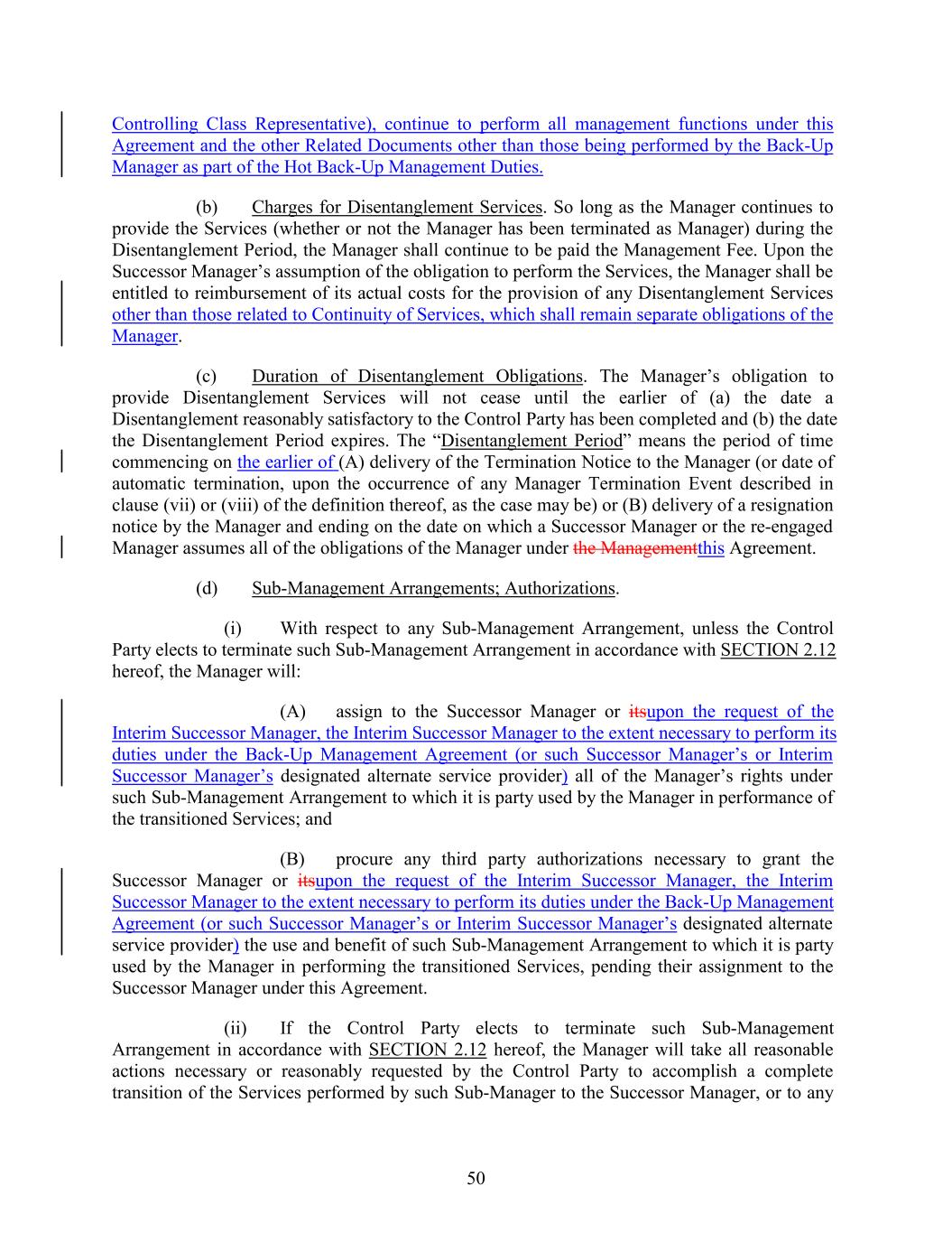 Controlling Class Representative), continue to perform all management functions under this Agreement and the other Related Documents other than those being performed by the Back-Up Manager as part of the Hot Back-Up Management Duties. (b) Charges for Disentanglement Services. So long as the Manager continues to provide the Services (whether or not the Manager has been terminated as Manager) during the Disentanglement Period, the Manager shall continue to be paid the Management Fee. Upon the Successor Manager’s assumption of the obligation to perform the Services, the Manager shall be entitled to reimbursement of its actual costs for the provision of any Disentanglement Services other than those related to Continuity of Services, which shall remain separate obligations of the Manager. (c) Duration of Disentanglement Obligations. The Manager’s obligation to provide Disentanglement Services will not cease until the earlier of (a) the date a Disentanglement reasonably satisfactory to the Control Party has been completed and (b) the date the Disentanglement Period expires. The “Disentanglement Period” means the period of time commencing on the earlier of (A) delivery of the Termination Notice to the Manager (or date of automatic termination, upon the occurrence of any Manager Termination Event described in clause (vii) or (viii) of the definition thereof, as the case may be) or (B) delivery of a resignation notice by the Manager and ending on the date on which a Successor Manager or the re-engaged Manager assumes all of the obligations of the Manager under the Managementthis Agreement. (d) Sub-Management Arrangements; Authorizations. (i) With respect to any Sub-Management Arrangement, unless the Control Party elects to terminate such Sub-Management Arrangement in accordance with SECTION 2.12 hereof, the Manager will: (A) assign to the Successor Manager or itsupon the request of the Interim Successor Manager, the Interim Successor Manager to the extent necessary to perform its duties under the Back-Up Management Agreement (or such Successor Manager’s or Interim Successor Manager’s designated alternate service provider) all of the Manager’s rights under such Sub-Management Arrangement to which it is party used by the Manager in performance of the transitioned Services; and (B) procure any third party authorizations necessary to grant the Successor Manager or itsupon the request of the Interim Successor Manager, the Interim Successor Manager to the extent necessary to perform its duties under the Back-Up Management Agreement (or such Successor Manager’s or Interim Successor Manager’s designated alternate service provider) the use and benefit of such Sub-Management Arrangement to which it is party used by the Manager in performing the transitioned Services, pending their assignment to the Successor Manager under this Agreement. (ii) If the Control Party elects to terminate such Sub-Management Arrangement in accordance with SECTION 2.12 hereof, the Manager will take all reasonable actions necessary or reasonably requested by the Control Party to accomplish a complete transition of the Services performed by such Sub-Manager to the Successor Manager, or to any 50