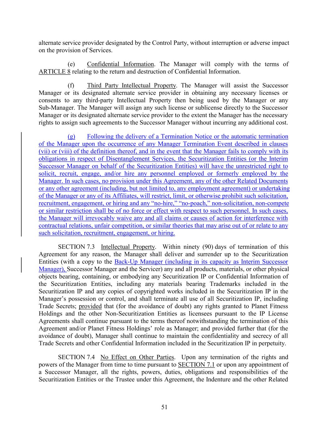 alternate service provider designated by the Control Party, without interruption or adverse impact on the provision of Services. (e) Confidential Information. The Manager will comply with the terms of ARTICLE 8 relating to the return and destruction of Confidential Information. (f) Third Party Intellectual Property. The Manager will assist the Successor Manager or its designated alternate service provider in obtaining any necessary licenses or consents to any third-party Intellectual Property then being used by the Manager or any Sub-Manager. The Manager will assign any such license or sublicense directly to the Successor Manager or its designated alternate service provider to the extent the Manager has the necessary rights to assign such agreements to the Successor Manager without incurring any additional cost. (g) Following the delivery of a Termination Notice or the automatic termination of the Manager upon the occurrence of any Manager Termination Event described in clauses (vii) or (viii) of the definition thereof, and in the event that the Manager fails to comply with its obligations in respect of Disentanglement Services, the Securitization Entities (or the Interim Successor Manager on behalf of the Securitization Entities) will have the unrestricted right to solicit, recruit, engage, and/or hire any personnel employed or formerly employed by the Manager. In such cases, no provision under this Agreement, any of the other Related Documents or any other agreement (including, but not limited to, any employment agreement) or undertaking of the Manager or any of its Affiliates, will restrict, limit, or otherwise prohibit such solicitation, recruitment, engagement, or hiring and any “no-hire,” “no-poach,” non-solicitation, non-compete or similar restriction shall be of no force or effect with respect to such personnel. In such cases, the Manager will irrevocably waive any and all claims or causes of action for interference with contractual relations, unfair competition, or similar theories that may arise out of or relate to any such solicitation, recruitment, engagement, or hiring. SECTION 7.3 Intellectual Property. Within ninety (90) days of termination of this Agreement for any reason, the Manager shall deliver and surrender up to the Securitization Entities (with a copy to the Back-Up Manager (including in its capacity as Interim Successor Manager), Successor Manager and the Servicer) any and all products, materials, or other physical objects bearing, containing, or embodying any Securitization IP or Confidential Information of the Securitization Entities, including any materials bearing Trademarks included in the Securitization IP and any copies of copyrighted works included in the Securitization IP in the Manager’s possession or control, and shall terminate all use of all Securitization IP, including Trade Secrets; provided that (for the avoidance of doubt) any rights granted to Planet Fitness Holdings and the other Non-Securitization Entities as licensees pursuant to the IP License Agreements shall continue pursuant to the terms thereof notwithstanding the termination of this Agreement and/or Planet Fitness Holdings’ role as Manager; and provided further that (for the avoidance of doubt), Manager shall continue to maintain the confidentiality and secrecy of all Trade Secrets and other Confidential Information included in the Securitization IP in perpetuity. SECTION 7.4 No Effect on Other Parties. Upon any termination of the rights and powers of the Manager from time to time pursuant to SECTION 7.1 or upon any appointment of a Successor Manager, all the rights, powers, duties, obligations and responsibilities of the Securitization Entities or the Trustee under this Agreement, the Indenture and the other Related 51