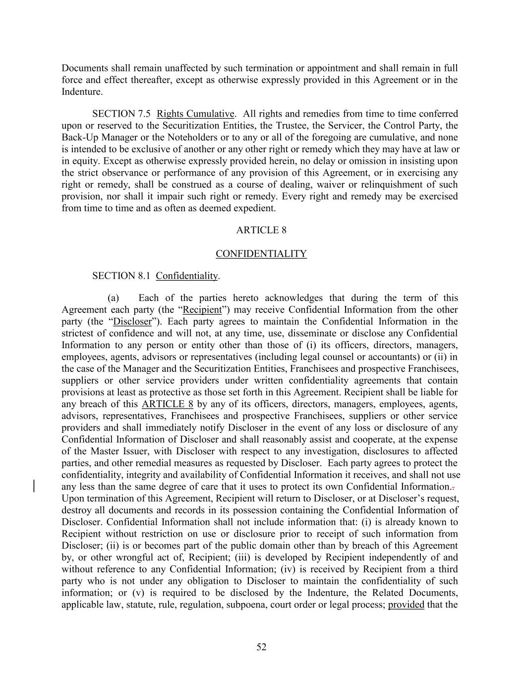 Documents shall remain unaffected by such termination or appointment and shall remain in full force and effect thereafter, except as otherwise expressly provided in this Agreement or in the Indenture. SECTION 7.5 Rights Cumulative. All rights and remedies from time to time conferred upon or reserved to the Securitization Entities, the Trustee, the Servicer, the Control Party, the Back-Up Manager or the Noteholders or to any or all of the foregoing are cumulative, and none is intended to be exclusive of another or any other right or remedy which they may have at law or in equity. Except as otherwise expressly provided herein, no delay or omission in insisting upon the strict observance or performance of any provision of this Agreement, or in exercising any right or remedy, shall be construed as a course of dealing, waiver or relinquishment of such provision, nor shall it impair such right or remedy. Every right and remedy may be exercised from time to time and as often as deemed expedient. ARTICLE 8 CONFIDENTIALITY SECTION 8.1 Confidentiality. (a) Each of the parties hereto acknowledges that during the term of this Agreement each party (the “Recipient”) may receive Confidential Information from the other party (the “Discloser”). Each party agrees to maintain the Confidential Information in the strictest of confidence and will not, at any time, use, disseminate or disclose any Confidential Information to any person or entity other than those of (i) its officers, directors, managers, employees, agents, advisors or representatives (including legal counsel or accountants) or (ii) in the case of the Manager and the Securitization Entities, Franchisees and prospective Franchisees, suppliers or other service providers under written confidentiality agreements that contain provisions at least as protective as those set forth in this Agreement. Recipient shall be liable for any breach of this ARTICLE 8 by any of its officers, directors, managers, employees, agents, advisors, representatives, Franchisees and prospective Franchisees, suppliers or other service providers and shall immediately notify Discloser in the event of any loss or disclosure of any Confidential Information of Discloser and shall reasonably assist and cooperate, at the expense of the Master Issuer, with Discloser with respect to any investigation, disclosures to affected parties, and other remedial measures as requested by Discloser. Each party agrees to protect the confidentiality, integrity and availability of Confidential Information it receives, and shall not use any less than the same degree of care that it uses to protect its own Confidential Information.. Upon termination of this Agreement, Recipient will return to Discloser, or at Discloser’s request, destroy all documents and records in its possession containing the Confidential Information of Discloser. Confidential Information shall not include information that: (i) is already known to Recipient without restriction on use or disclosure prior to receipt of such information from Discloser; (ii) is or becomes part of the public domain other than by breach of this Agreement by, or other wrongful act of, Recipient; (iii) is developed by Recipient independently of and without reference to any Confidential Information; (iv) is received by Recipient from a third party who is not under any obligation to Discloser to maintain the confidentiality of such information; or (v) is required to be disclosed by the Indenture, the Related Documents, applicable law, statute, rule, regulation, subpoena, court order or legal process; provided that the 52