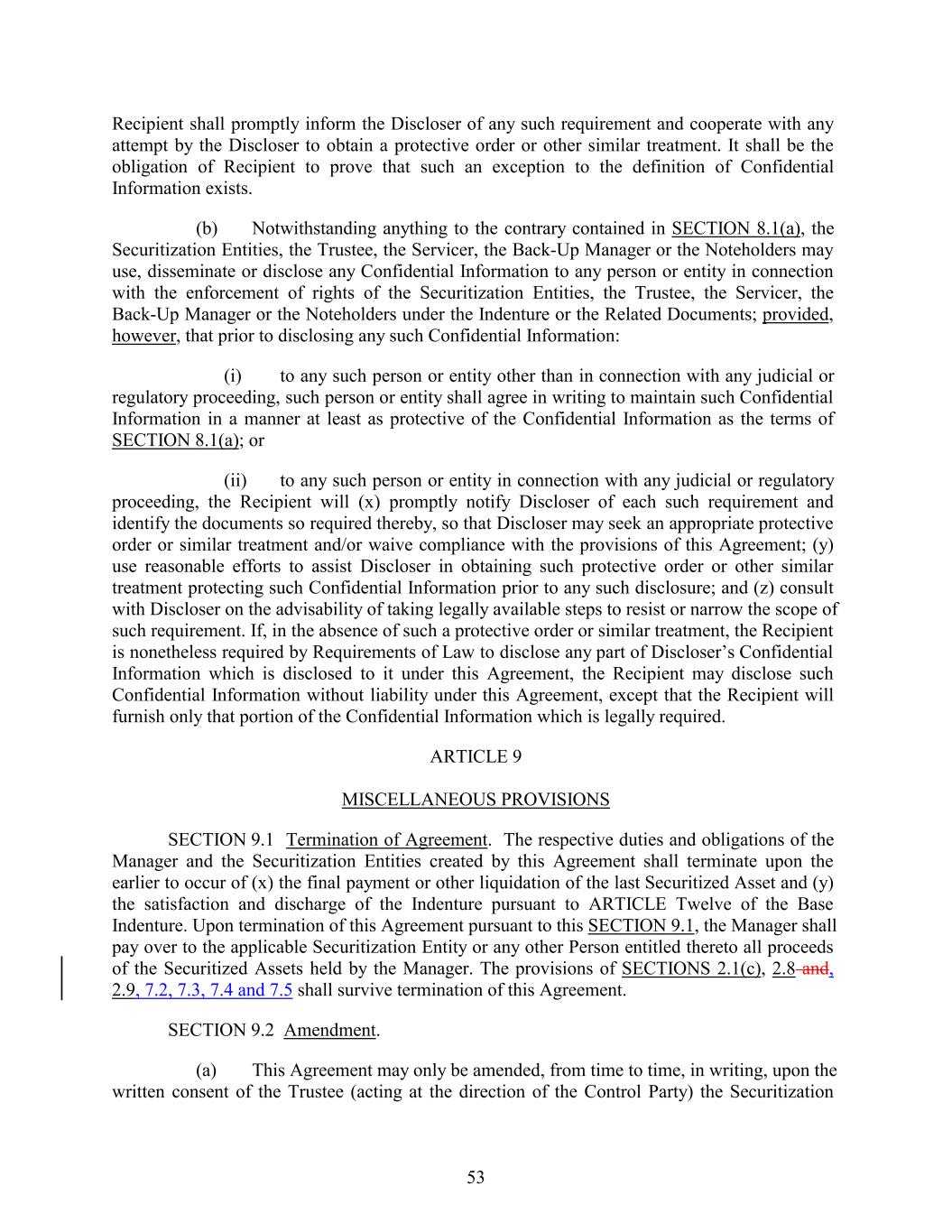 Recipient shall promptly inform the Discloser of any such requirement and cooperate with any attempt by the Discloser to obtain a protective order or other similar treatment. It shall be the obligation of Recipient to prove that such an exception to the definition of Confidential Information exists. (b) Notwithstanding anything to the contrary contained in SECTION 8.1(a), the Securitization Entities, the Trustee, the Servicer, the Back-Up Manager or the Noteholders may use, disseminate or disclose any Confidential Information to any person or entity in connection with the enforcement of rights of the Securitization Entities, the Trustee, the Servicer, the Back-Up Manager or the Noteholders under the Indenture or the Related Documents; provided, however, that prior to disclosing any such Confidential Information: (i) to any such person or entity other than in connection with any judicial or regulatory proceeding, such person or entity shall agree in writing to maintain such Confidential Information in a manner at least as protective of the Confidential Information as the terms of SECTION 8.1(a); or (ii) to any such person or entity in connection with any judicial or regulatory proceeding, the Recipient will (x) promptly notify Discloser of each such requirement and identify the documents so required thereby, so that Discloser may seek an appropriate protective order or similar treatment and/or waive compliance with the provisions of this Agreement; (y) use reasonable efforts to assist Discloser in obtaining such protective order or other similar treatment protecting such Confidential Information prior to any such disclosure; and (z) consult with Discloser on the advisability of taking legally available steps to resist or narrow the scope of such requirement. If, in the absence of such a protective order or similar treatment, the Recipient is nonetheless required by Requirements of Law to disclose any part of Discloser’s Confidential Information which is disclosed to it under this Agreement, the Recipient may disclose such Confidential Information without liability under this Agreement, except that the Recipient will furnish only that portion of the Confidential Information which is legally required. ARTICLE 9 MISCELLANEOUS PROVISIONS SECTION 9.1 Termination of Agreement. The respective duties and obligations of the Manager and the Securitization Entities created by this Agreement shall terminate upon the earlier to occur of (x) the final payment or other liquidation of the last Securitized Asset and (y) the satisfaction and discharge of the Indenture pursuant to ARTICLE Twelve of the Base Indenture. Upon termination of this Agreement pursuant to this SECTION 9.1, the Manager shall pay over to the applicable Securitization Entity or any other Person entitled thereto all proceeds of the Securitized Assets held by the Manager. The provisions of SECTIONS 2.1(c), 2.8 and, 2.9, 7.2, 7.3, 7.4 and 7.5 shall survive termination of this Agreement. SECTION 9.2 Amendment. (a) This Agreement may only be amended, from time to time, in writing, upon the written consent of the Trustee (acting at the direction of the Control Party) the Securitization 53