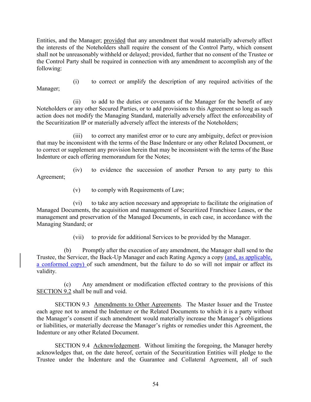 Entities, and the Manager; provided that any amendment that would materially adversely affect the interests of the Noteholders shall require the consent of the Control Party, which consent shall not be unreasonably withheld or delayed; provided, further that no consent of the Trustee or the Control Party shall be required in connection with any amendment to accomplish any of the following: (i) to correct or amplify the description of any required activities of the Manager; (ii) to add to the duties or covenants of the Manager for the benefit of any Noteholders or any other Secured Parties, or to add provisions to this Agreement so long as such action does not modify the Managing Standard, materially adversely affect the enforceability of the Securitization IP or materially adversely affect the interests of the Noteholders; (iii) to correct any manifest error or to cure any ambiguity, defect or provision that may be inconsistent with the terms of the Base Indenture or any other Related Document, or to correct or supplement any provision herein that may be inconsistent with the terms of the Base Indenture or each offering memorandum for the Notes; (iv) to evidence the succession of another Person to any party to this Agreement; (v) to comply with Requirements of Law; (vi) to take any action necessary and appropriate to facilitate the origination of Managed Documents, the acquisition and management of Securitized Franchisee Leases, or the management and preservation of the Managed Documents, in each case, in accordance with the Managing Standard; or (vii) to provide for additional Services to be provided by the Manager. (b) Promptly after the execution of any amendment, the Manager shall send to the Trustee, the Servicer, the Back-Up Manager and each Rating Agency a copy (and, as applicable, a conformed copy) of such amendment, but the failure to do so will not impair or affect its validity. (c) Any amendment or modification effected contrary to the provisions of this SECTION 9.2 shall be null and void. SECTION 9.3 Amendments to Other Agreements. The Master Issuer and the Trustee each agree not to amend the Indenture or the Related Documents to which it is a party without the Manager’s consent if such amendment would materially increase the Manager’s obligations or liabilities, or materially decrease the Manager’s rights or remedies under this Agreement, the Indenture or any other Related Document. SECTION 9.4 Acknowledgement. Without limiting the foregoing, the Manager hereby acknowledges that, on the date hereof, certain of the Securitization Entities will pledge to the Trustee under the Indenture and the Guarantee and Collateral Agreement, all of such 54