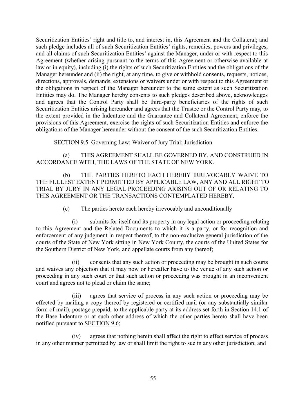 Securitization Entities’ right and title to, and interest in, this Agreement and the Collateral; and such pledge includes all of such Securitization Entities’ rights, remedies, powers and privileges, and all claims of such Securitization Entities’ against the Manager, under or with respect to this Agreement (whether arising pursuant to the terms of this Agreement or otherwise available at law or in equity), including (i) the rights of such Securitization Entities and the obligations of the Manager hereunder and (ii) the right, at any time, to give or withhold consents, requests, notices, directions, approvals, demands, extensions or waivers under or with respect to this Agreement or the obligations in respect of the Manager hereunder to the same extent as such Securitization Entities may do. The Manager hereby consents to such pledges described above, acknowledges and agrees that the Control Party shall be third-party beneficiaries of the rights of such Securitization Entities arising hereunder and agrees that the Trustee or the Control Party may, to the extent provided in the Indenture and the Guarantee and Collateral Agreement, enforce the provisions of this Agreement, exercise the rights of such Securitization Entities and enforce the obligations of the Manager hereunder without the consent of the such Securitization Entities. SECTION 9.5 Governing Law; Waiver of Jury Trial; Jurisdiction. (a) THIS AGREEMENT SHALL BE GOVERNED BY, AND CONSTRUED IN ACCORDANCE WITH, THE LAWS OF THE STATE OF NEW YORK. (b) THE PARTIES HERETO EACH HEREBY IRREVOCABLY WAIVE TO THE FULLEST EXTENT PERMITTED BY APPLICABLE LAW, ANY AND ALL RIGHT TO TRIAL BY JURY IN ANY LEGAL PROCEEDING ARISING OUT OF OR RELATING TO THIS AGREEMENT OR THE TRANSACTIONS CONTEMPLATED HEREBY. (c) The parties hereto each hereby irrevocably and unconditionally (i) submits for itself and its property in any legal action or proceeding relating to this Agreement and the Related Documents to which it is a party, or for recognition and enforcement of any judgment in respect thereof, to the non-exclusive general jurisdiction of the courts of the State of New York sitting in New York County, the courts of the United States for the Southern District of New York, and appellate courts from any thereof; (ii) consents that any such action or proceeding may be brought in such courts and waives any objection that it may now or hereafter have to the venue of any such action or proceeding in any such court or that such action or proceeding was brought in an inconvenient court and agrees not to plead or claim the same; (iii) agrees that service of process in any such action or proceeding may be effected by mailing a copy thereof by registered or certified mail (or any substantially similar form of mail), postage prepaid, to the applicable party at its address set forth in Section 14.1 of the Base Indenture or at such other address of which the other parties hereto shall have been notified pursuant to SECTION 9.6; (iv) agrees that nothing herein shall affect the right to effect service of process in any other manner permitted by law or shall limit the right to sue in any other jurisdiction; and 55