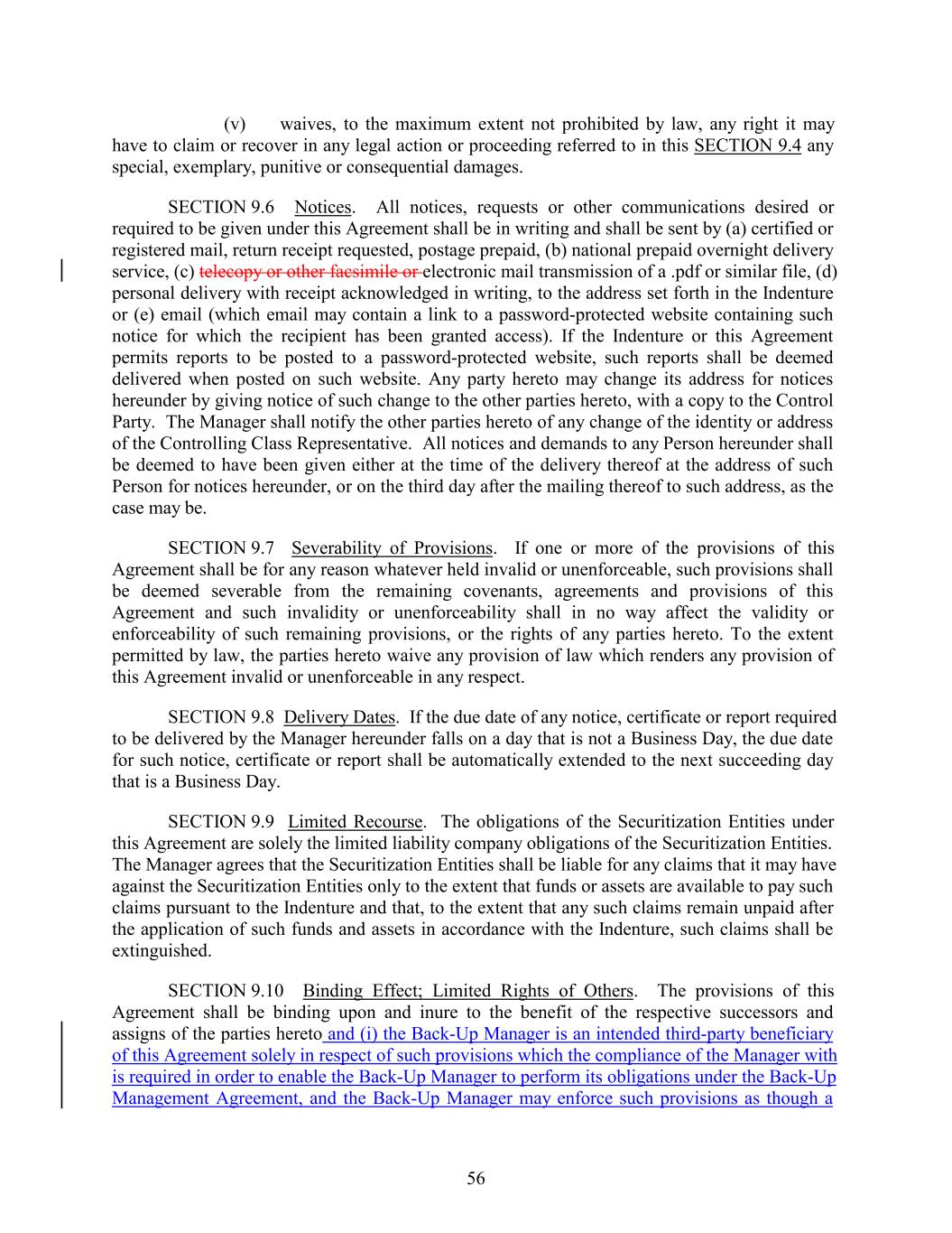 (v) waives, to the maximum extent not prohibited by law, any right it may have to claim or recover in any legal action or proceeding referred to in this SECTION 9.4 any special, exemplary, punitive or consequential damages. SECTION 9.6 Notices. All notices, requests or other communications desired or required to be given under this Agreement shall be in writing and shall be sent by (a) certified or registered mail, return receipt requested, postage prepaid, (b) national prepaid overnight delivery service, (c) telecopy or other facsimile or electronic mail transmission of a .pdf or similar file, (d) personal delivery with receipt acknowledged in writing, to the address set forth in the Indenture or (e) email (which email may contain a link to a password-protected website containing such notice for which the recipient has been granted access). If the Indenture or this Agreement permits reports to be posted to a password-protected website, such reports shall be deemed delivered when posted on such website. Any party hereto may change its address for notices hereunder by giving notice of such change to the other parties hereto, with a copy to the Control Party. The Manager shall notify the other parties hereto of any change of the identity or address of the Controlling Class Representative. All notices and demands to any Person hereunder shall be deemed to have been given either at the time of the delivery thereof at the address of such Person for notices hereunder, or on the third day after the mailing thereof to such address, as the case may be. SECTION 9.7 Severability of Provisions. If one or more of the provisions of this Agreement shall be for any reason whatever held invalid or unenforceable, such provisions shall be deemed severable from the remaining covenants, agreements and provisions of this Agreement and such invalidity or unenforceability shall in no way affect the validity or enforceability of such remaining provisions, or the rights of any parties hereto. To the extent permitted by law, the parties hereto waive any provision of law which renders any provision of this Agreement invalid or unenforceable in any respect. SECTION 9.8 Delivery Dates. If the due date of any notice, certificate or report required to be delivered by the Manager hereunder falls on a day that is not a Business Day, the due date for such notice, certificate or report shall be automatically extended to the next succeeding day that is a Business Day. SECTION 9.9 Limited Recourse. The obligations of the Securitization Entities under this Agreement are solely the limited liability company obligations of the Securitization Entities. The Manager agrees that the Securitization Entities shall be liable for any claims that it may have against the Securitization Entities only to the extent that funds or assets are available to pay such claims pursuant to the Indenture and that, to the extent that any such claims remain unpaid after the application of such funds and assets in accordance with the Indenture, such claims shall be extinguished. SECTION 9.10 Binding Effect; Limited Rights of Others. The provisions of this Agreement shall be binding upon and inure to the benefit of the respective successors and assigns of the parties hereto and (i) the Back-Up Manager is an intended third-party beneficiary of this Agreement solely in respect of such provisions which the compliance of the Manager with is required in order to enable the Back-Up Manager to perform its obligations under the Back-Up Management Agreement, and the Back-Up Manager may enforce such provisions as though a 56
