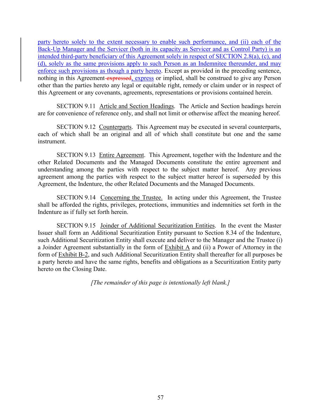 party hereto solely to the extent necessary to enable such performance, and (ii) each of the Back-Up Manager and the Servicer (both in its capacity as Servicer and as Control Party) is an intended third-party beneficiary of this Agreement solely in respect of SECTION 2.8(a), (c), and (d), solely as the same provisions apply to such Person as an Indemnitee thereunder, and may enforce such provisions as though a party hereto. Except as provided in the preceding sentence, nothing in this Agreement expressed, express or implied, shall be construed to give any Person other than the parties hereto any legal or equitable right, remedy or claim under or in respect of this Agreement or any covenants, agreements, representations or provisions contained herein. SECTION 9.11 Article and Section Headings. The Article and Section headings herein are for convenience of reference only, and shall not limit or otherwise affect the meaning hereof. SECTION 9.12 Counterparts. This Agreement may be executed in several counterparts, each of which shall be an original and all of which shall constitute but one and the same instrument. SECTION 9.13 Entire Agreement. This Agreement, together with the Indenture and the other Related Documents and the Managed Documents constitute the entire agreement and understanding among the parties with respect to the subject matter hereof. Any previous agreement among the parties with respect to the subject matter hereof is superseded by this Agreement, the Indenture, the other Related Documents and the Managed Documents. SECTION 9.14 Concerning the Trustee. In acting under this Agreement, the Trustee shall be afforded the rights, privileges, protections, immunities and indemnities set forth in the Indenture as if fully set forth herein. SECTION 9.15 Joinder of Additional Securitization Entities. In the event the Master Issuer shall form an Additional Securitization Entity pursuant to Section 8.34 of the Indenture, such Additional Securitization Entity shall execute and deliver to the Manager and the Trustee (i) a Joinder Agreement substantially in the form of Exhibit A and (ii) a Power of Attorney in the form of Exhibit B-2, and such Additional Securitization Entity shall thereafter for all purposes be a party hereto and have the same rights, benefits and obligations as a Securitization Entity party hereto on the Closing Date. [The remainder of this page is intentionally left blank.] 57