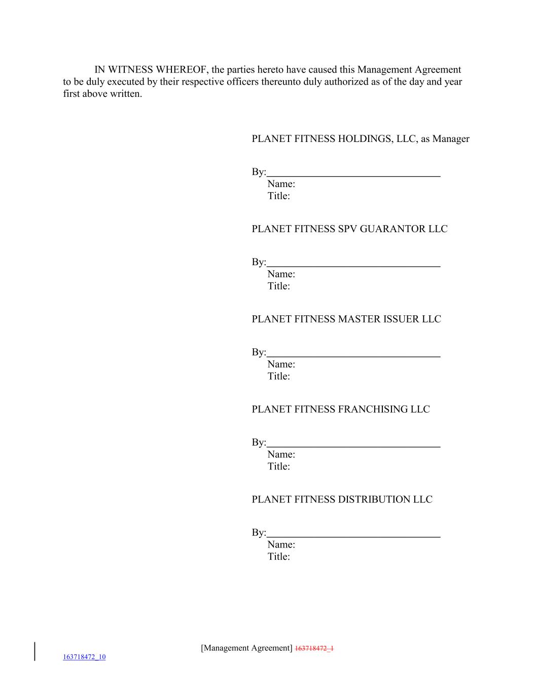 IN WITNESS WHEREOF, the parties hereto have caused this Management Agreement to be duly executed by their respective officers thereunto duly authorized as of the day and year first above written. PLANET FITNESS HOLDINGS, LLC, as Manager By: Name: Title: PLANET FITNESS SPV GUARANTOR LLC By: Name: Title: PLANET FITNESS MASTER ISSUER LLC By: Name: Title: PLANET FITNESS FRANCHISING LLC By: Name: Title: PLANET FITNESS DISTRIBUTION LLC By: Name: Title: [Management Agreement] 163718472_1 163718472_10
