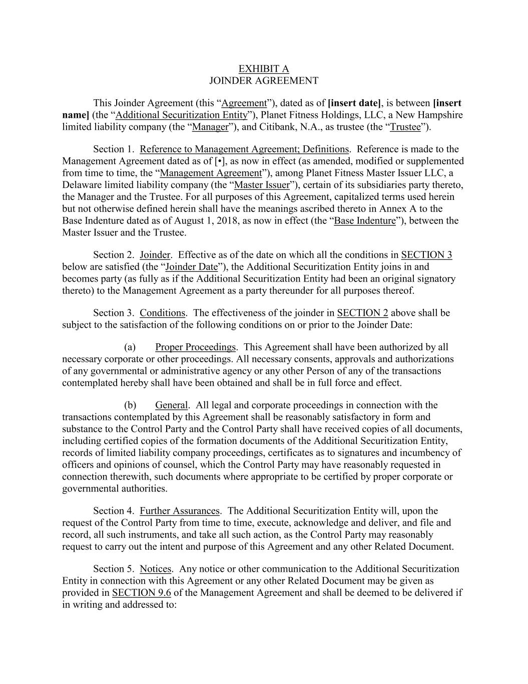 EXHIBIT A JOINDER AGREEMENT This Joinder Agreement (this “Agreement”), dated as of [insert date], is between [insert name] (the “Additional Securitization Entity”), Planet Fitness Holdings, LLC, a New Hampshire limited liability company (the “Manager”), and Citibank, N.A., as trustee (the “Trustee”). Section 1. Reference to Management Agreement; Definitions. Reference is made to the Management Agreement dated as of [•], as now in effect (as amended, modified or supplemented from time to time, the “Management Agreement”), among Planet Fitness Master Issuer LLC, a Delaware limited liability company (the “Master Issuer”), certain of its subsidiaries party thereto, the Manager and the Trustee. For all purposes of this Agreement, capitalized terms used herein but not otherwise defined herein shall have the meanings ascribed thereto in Annex A to the Base Indenture dated as of August 1, 2018, as now in effect (the “Base Indenture”), between the Master Issuer and the Trustee. Section 2. Joinder. Effective as of the date on which all the conditions in SECTION 3 below are satisfied (the “Joinder Date”), the Additional Securitization Entity joins in and becomes party (as fully as if the Additional Securitization Entity had been an original signatory thereto) to the Management Agreement as a party thereunder for all purposes thereof. Section 3. Conditions. The effectiveness of the joinder in SECTION 2 above shall be subject to the satisfaction of the following conditions on or prior to the Joinder Date: (a) Proper Proceedings. This Agreement shall have been authorized by all necessary corporate or other proceedings. All necessary consents, approvals and authorizations of any governmental or administrative agency or any other Person of any of the transactions contemplated hereby shall have been obtained and shall be in full force and effect. (b) General. All legal and corporate proceedings in connection with the transactions contemplated by this Agreement shall be reasonably satisfactory in form and substance to the Control Party and the Control Party shall have received copies of all documents, including certified copies of the formation documents of the Additional Securitization Entity, records of limited liability company proceedings, certificates as to signatures and incumbency of officers and opinions of counsel, which the Control Party may have reasonably requested in connection therewith, such documents where appropriate to be certified by proper corporate or governmental authorities. Section 4. Further Assurances. The Additional Securitization Entity will, upon the request of the Control Party from time to time, execute, acknowledge and deliver, and file and record, all such instruments, and take all such action, as the Control Party may reasonably request to carry out the intent and purpose of this Agreement and any other Related Document. Section 5. Notices. Any notice or other communication to the Additional Securitization Entity in connection with this Agreement or any other Related Document may be given as provided in SECTION 9.6 of the Management Agreement and shall be deemed to be delivered if in writing and addressed to: