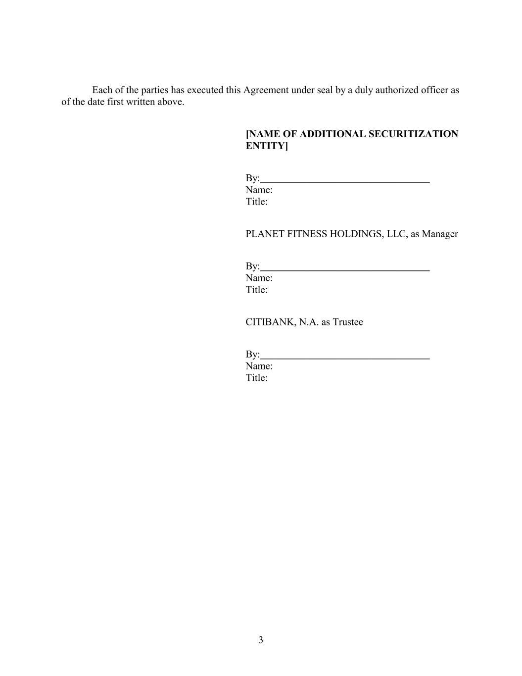 Each of the parties has executed this Agreement under seal by a duly authorized officer as of the date first written above. [NAME OF ADDITIONAL SECURITIZATION ENTITY] By: Name: Title: PLANET FITNESS HOLDINGS, LLC, as Manager By: Name: Title: CITIBANK, N.A. as Trustee By: Name: Title: 3