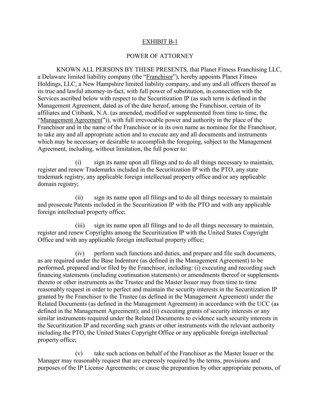 EXHIBIT B-1 POWER OF ATTORNEY KNOWN ALL PERSONS BY THESE PRESENTS, that Planet Fitness Franchising LLC, a Delaware limited liability company (the “Franchisor”), hereby appoints Planet Fitness Holdings, LLC, a New Hampshire limited liability company, and any and all officers thereof as its true and lawful attorney-in-fact, with full power of substitution, in connection with the Services ascribed below with respect to the Securitization IP (as such term is defined in the Management Agreement, dated as of the date hereof, among the Franchisor, certain of its affiliates and Citibank, N.A. (as amended, modified or supplemented from time to time, the “Management Agreement”)), with full irrevocable power and authority in the place of the Franchisor and in the name of the Franchisor or in its own name as nominee for the Franchisor, to take any and all appropriate action and to execute any and all documents and instruments which may be necessary or desirable to accomplish the foregoing, subject to the Management Agreement, including, without limitation, the full power to: (i) sign its name upon all filings and to do all things necessary to maintain, register and renew Trademarks included in the Securitization IP with the PTO, any state trademark registry, any applicable foreign intellectual property office and/or any applicable domain registry; (ii) sign its name upon all filings and to do all things necessary to maintain and prosecute Patents included in the Securitization IP with the PTO and with any applicable foreign intellectual property office; (iii) sign its name upon all filings and to do all things necessary to maintain, register and renew Copyrights among the Securitization IP with the United States Copyright Office and with any applicable foreign intellectual property office; (iv) perform such functions and duties, and prepare and file such documents, as are required under the Base Indenture (as defined in the Management Agreement) to be performed, prepared and/or filed by the Franchisor, including: (i) executing and recording such financing statements (including continuation statements) or amendments thereof or supplements thereto or other instruments as the Trustee and the Master Issuer may from time to time reasonably request in order to perfect and maintain the security interests in the Securitization IP granted by the Franchisor to the Trustee (as defined in the Management Agreement) under the Related Documents (as defined in the Management Agreement) in accordance with the UCC (as defined in the Management Agreement); and (ii) executing grants of security interests or any similar instruments required under the Related Documents to evidence such security interests in the Securitization IP and recording such grants or other instruments with the relevant authority including the PTO, the United States Copyright Office or any applicable foreign intellectual property office; (v) take such actions on behalf of the Franchisor as the Master Issuer or the Manager may reasonably request that are expressly required by the terms, provisions and purposes of the IP License Agreements; or cause the preparation by other appropriate persons, of