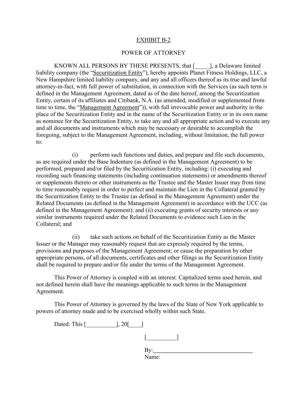 EXHIBIT B-2 POWER OF ATTORNEY KNOWN ALL PERSONS BY THESE PRESENTS, that [_____], a Delaware limited liability company (the “Securitization Entity”), hereby appoints Planet Fitness Holdings, LLC, a New Hampshire limited liability company, and any and all officers thereof as its true and lawful attorney-in-fact, with full power of substitution, in connection with the Services (as such term is defined in the Management Agreement, dated as of the date hereof, among the Securitization Entity, certain of its affiliates and Citibank, N.A. (as amended, modified or supplemented from time to time, the “Management Agreement”)), with full irrevocable power and authority in the place of the Securitization Entity and in the name of the Securitization Entity or in its own name as nominee for the Securitization Entity, to take any and all appropriate action and to execute any and all documents and instruments which may be necessary or desirable to accomplish the foregoing, subject to the Management Agreement, including, without limitation, the full power to: (i) perform such functions and duties, and prepare and file such documents, as are required under the Base Indenture (as defined in the Management Agreement) to be performed, prepared and/or filed by the Securitization Entity, including: (i) executing and recording such financing statements (including continuation statements) or amendments thereof or supplements thereto or other instruments as the Trustee and the Master Issuer may from time to time reasonably request in order to perfect and maintain the Lien in the Collateral granted by the Securitization Entity to the Trustee (as defined in the Management Agreement) under the Related Documents (as defined in the Management Agreement) in accordance with the UCC (as defined in the Management Agreement); and (ii) executing grants of security interests or any similar instruments required under the Related Documents to evidence such Lien in the Collateral; and (ii) take such actions on behalf of the Securitization Entity as the Master Issuer or the Manager may reasonably request that are expressly required by the terms, provisions and purposes of the Management Agreement; or cause the preparation by other appropriate persons, of all documents, certificates and other filings as the Securitization Entity shall be required to prepare and/or file under the terms of the Management Agreement. This Power of Attorney is coupled with an interest. Capitalized terms used herein, and not defined herein shall have the meanings applicable to such terms in the Management Agreement. This Power of Attorney is governed by the laws of the State of New York applicable to powers of attorney made and to be exercised wholly within such State. Dated: This [__________], 20[____] [__________] By: Name: