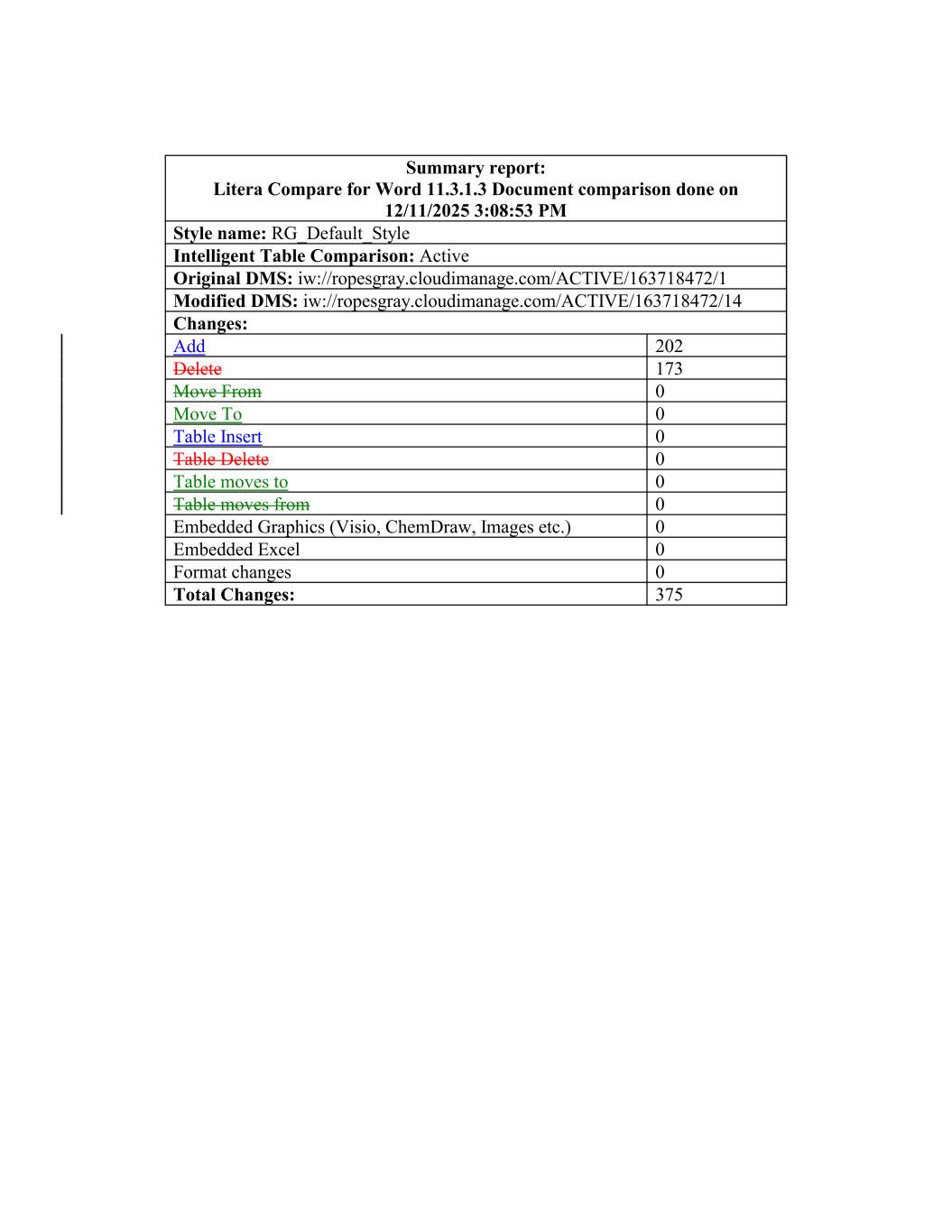 0 Table Insert Changes: 0 Table Delete 0 Add Intelligent Table Comparison: Active Table moves to 202 0 Summary report: Litera Compare for Word 11.3.1.3 Document comparison done on 12/11/2025 3:08:53 PM Table moves from 0 Delete Embedded Graphics (Visio, ChemDraw, Images etc.) 173 0 Original DMS: iw://ropesgray.cloudimanage.com/ACTIVE/163718472/1 Embedded Excel 0 Move From Format changes 0 0 Total Changes: Modified DMS: iw://ropesgray.cloudimanage.com/ACTIVE/163718472/14 375 Move To Style name: RG_Default_Style