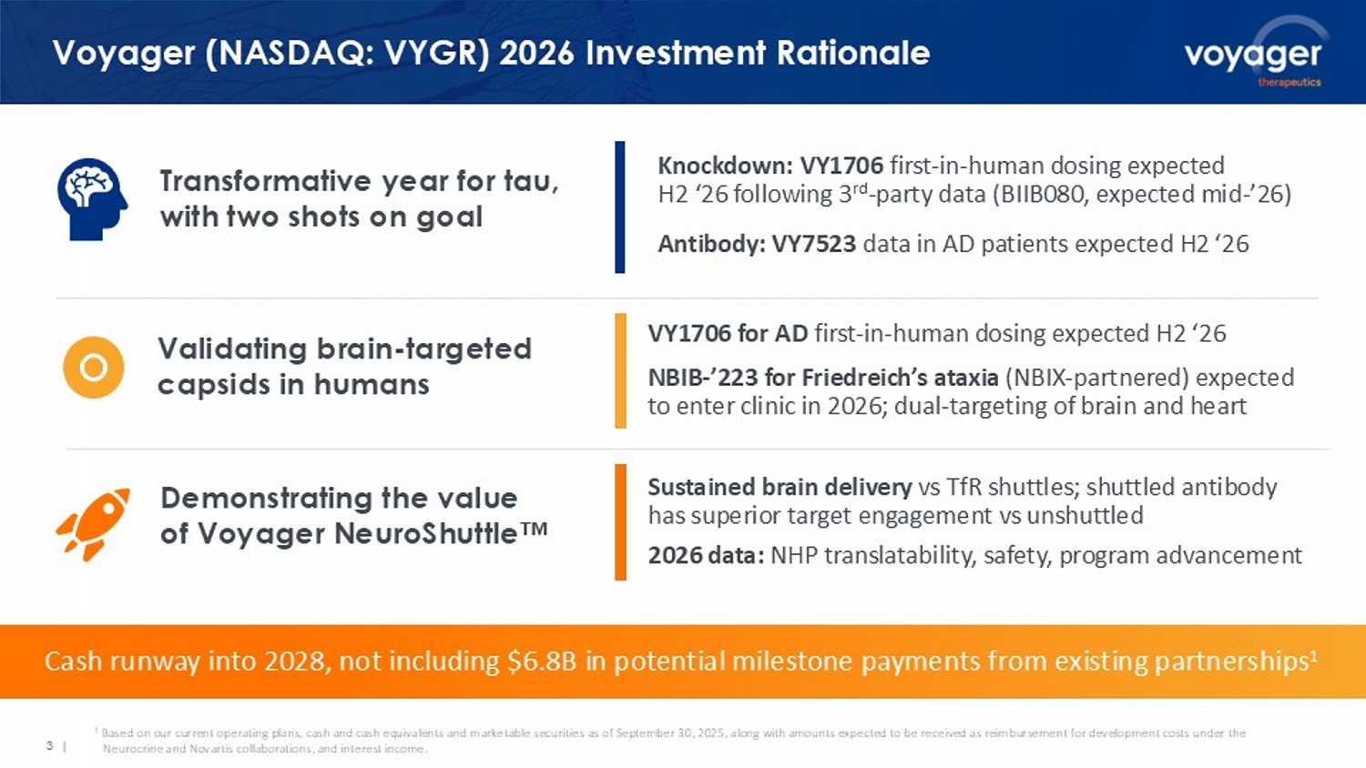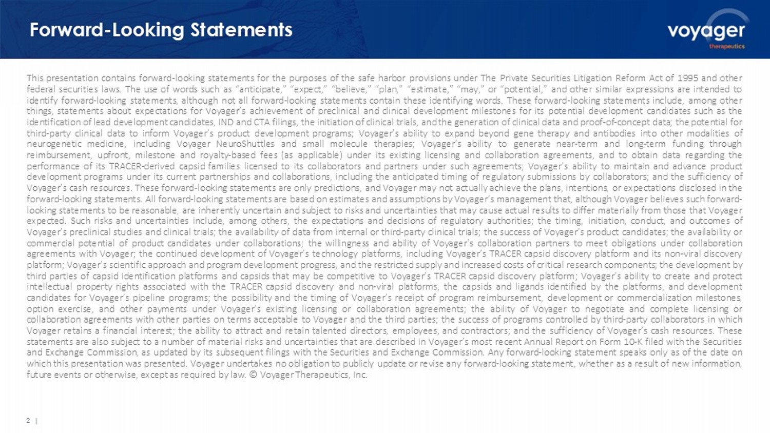 2 | Forward - Looking Statements This presentation contains forward - looking statements for the purposes of the safe harbor provisions under The Private Securities Litigation Reform Act of 1995 and other federal securities laws . The use of words such as “anticipate,” “expect,” “believe,” “plan,” “estimate,” “may,” or “potential,” and other similar expressions are intended to identify forward - looking statements, although not all forward - looking statements contain these identifying words . These forward - looking statements include, among other things, statements about expectations for Voyager’s achievement of preclinical and clinical development milestones for its potential development candidates such as the identification of lead development candidates, IND and CTA filings, the initiation of clinical trials, and the generation of clinical data and proof - of - concept data ; the potential for third - party clinical data to inform Voyager’s product development programs ; Voyager’s ability to expand beyond gene therapy and antibodies into other modalities of neurogenetic medicine, including Voyager NeuroShuttles and small molecule therapies ; Voyager’s ability to generate near - term and long - term funding through reimbursement, upfront, milestone and royalty - based fees (as applicable) under its existing licensing and collaboration agreements, and to obtain data regarding the performance of its TRACER - derived capsid families licensed to its collaborators and partners under such agreements ; Voyager’s ability to maintain and advance product development programs under its current partnerships and collaborations, including the anticipated timing of regulatory submissions by collaborators ; and the sufficiency of Voyager’s cash resources . These forward - looking statements are only predictions, and Voyager may not actually achieve the plans, intentions, or expectations disclosed in the forward - looking statements . All forward - looking statements are based on estimates and assumptions by Voyager’s management that, although Voyager believes such forward - looking statements to be reasonable, are inherently uncertain and subject to risks and uncertainties that may cause actual results to differ materially from those that Voyager expected . Such risks and uncertainties include, among others, the expectations and decisions of regulatory authorities ; the timing, initiation, conduct, and outcomes of Voyager’s preclinical studies and clinical trials ; the availability of data from internal or third - party clinical trials ; the success of Voyager’s product candidates ; the availability or commercial potential of product candidates under collaborations ; the willingness and ability of Voyager's collaboration partners to meet obligations under collaboration agreements with Voyager ; the continued development of Voyager’s technology platforms, including Voyager’s TRACER capsid discovery platform and its non - viral discovery platform ; Voyager’s scientific approach and program development progress, and the restricted supply and increased costs of critical research components ; the development by third parties of capsid identification platforms and capsids that may be competitive to Voyager’s TRACER capsid discovery platform ; Voyager’s ability to create and protect intellectual property rights associated with the TRACER capsid discovery and non - viral platforms, the capsids and ligands identified by the platforms, and development candidates for Voyager’s pipeline programs ; the possibility and the timing of Voyager’s receipt of program reimbursement, development or commercialization milestones, option exercise, and other payments under Voyager’s existing licensing or collaboration agreements ; the ability of Voyager to negotiate and complete licensing or collaboration agreements with other parties on terms acceptable to Voyager and the third parties ; the success of programs controlled by third - party collaborators in which Voyager retains a financial interest ; the ability to attract and retain talented directors, employees, and contractors ; and the sufficiency of Voyager’s cash resources . These statements are also subject to a number of material risks and uncertainties that are described in Voyager’s most recent Annual Report on Form 10 - K filed with the Securities and Exchange Commission, as updated by its subsequent filings with the Securities and Exchange Commission . Any forward - looking statement speaks only as of the date on which this presentation was presented . Voyager undertakes no obligation to publicly update or revise any forward - looking statement, whether as a result of new information, future events or otherwise, except as required by law . © Voyager Therapeutics, Inc .