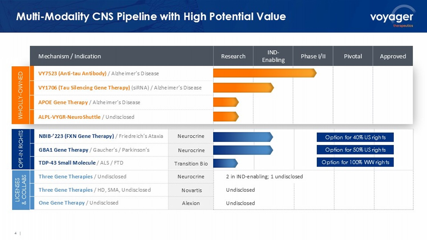 3 | Voyager (NASDAQ: VYGR) 2026 Investment Rationale Validating brain - targeted capsids in humans Transformative year for tau, with two s hots on goal Demonstrating the value of Voyager NeuroShuttle 1 Based on our current operating plans, cash and cash equivalents and marketable securities as of September 30, 2025, along wit h a mounts expected to be received as reimbursement for development costs under the Neurocrine and Novartis collaborations, and interest income. Cash runway into 2028, not including $ 6.8 B in potential milestone payments from existing partnerships 1 Antibody: VY7523 data in AD patients expected H2 ‘ 26 Knockdown: VY1706 first - in - human dosing expected H2 ‘ 26 following 3 rd - party data ( BIIB080 , expected mid - ’26) Sustained brain delivery vs TfR shuttles ; shuttled antibody has superior target engagement vs unshuttled 2026 data: NHP translatability, safety, program advancement VY1706 for AD first - in - human dosing expected H2 ‘ 26 NBIB - ’223 for Friedreich’s ataxia ( NBIX - partnered ) expected to enter clinic in 2026; dual - targeting of brain and heart