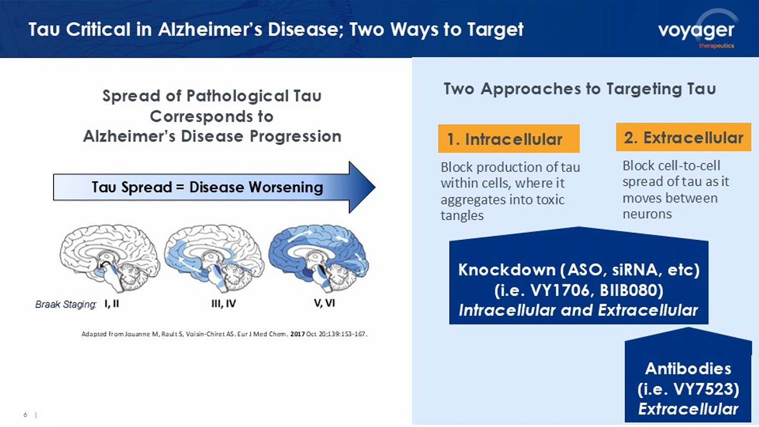 6 | Tau Critical in Alzheimer’s Disease; Two Ways to Target Braak Staging: Adapted from Jouanne M, Rault S, Voisin - Chiret AS. Eur J Med Chem. 2017 Oct 20;139:153 - 167. Spread of Pathological Tau Corresponds to Alzheimer’s Disease Progression Tau Spread = Disease Worsening Two Approaches to Targeting Tau 1. Intracellular 2. Extracellular Block production of tau within cells, where it aggregates into toxic tangles Block cell - to - cell spread of tau as it moves between neurons Knockdown (ASO, siRNA, etc ) (i.e. VY1706, BIIB080) Intracellular and Extracellular Antibodies (i.e. VY7523) Extracellular