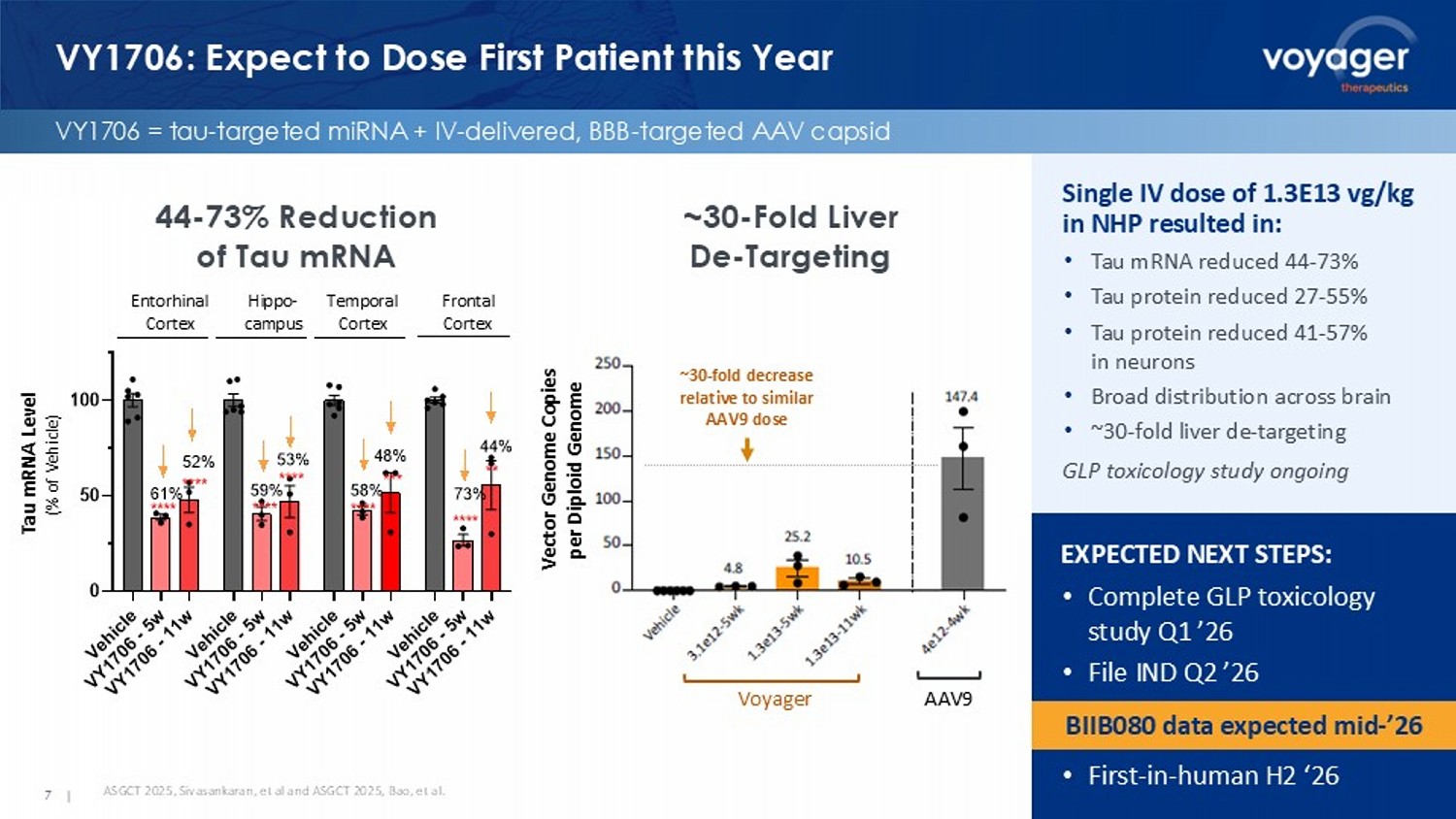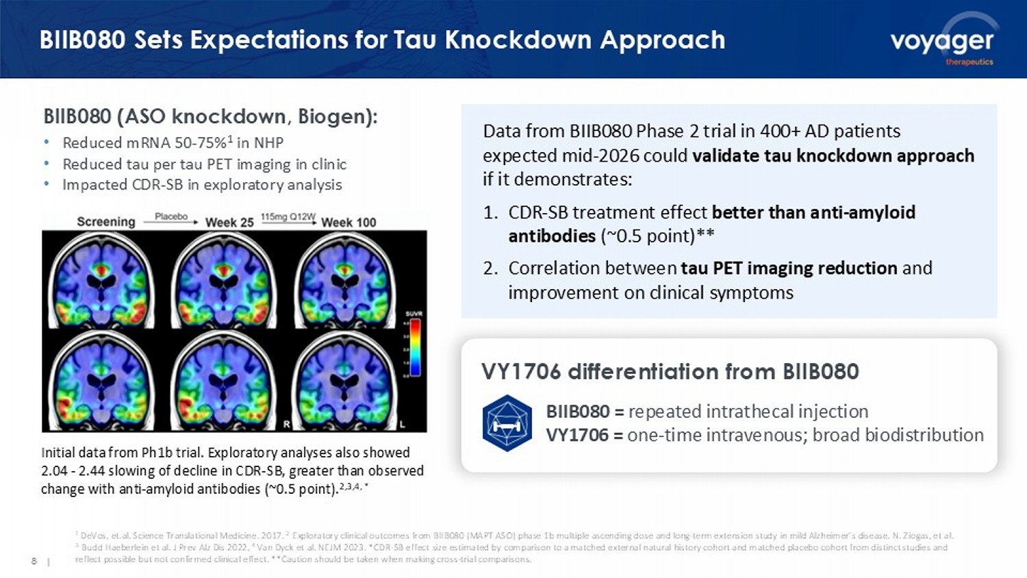 Voyager AAV9 ~30 - fold decrease relative to similar AAV9 dose Vector Genome Copies per Diploid Genome VY1706: Expect to Dose First Patient this Year VY1706 = tau - targeted miRNA + IV - delivered, BBB - targeted AAV capsid 7 | EXPECTED NEXT STEPS: • Complete GLP toxicology study Q1 ’26 • File IND Q2 ’26 • First - in - human H2 ‘26 ASGCT 2025, Sivasankaran, et al and ASGCT 2025, Bao, et al. Single IV dose of 1.3E13 vg/kg in NHP resulted in: • Tau mRNA reduced 44 - 73% • Tau protein reduced 27 - 55% • Tau protein reduced 41 - 57% in neurons • Broad distribution across brain • ~30 - fold liver de - targeting GLP toxicology study ongoing 44 - 73% Reduction of Tau mRNA ~30 - Fold Liver De - Targeting BIIB080 data expected mid - ’26 V e h i c l e V Y 1 7 0 6 - 5 w V Y 1 7 0 6 - 1 1 w V e h i c l e V Y 1 7 0 6 - 5 w V Y 1 7 0 6 - 1 1 w V e h i c l e V Y 1 7 0 6 - 5 w V Y 1 7 0 6 - 1 1 w V e h i c l e V Y 1 7 0 6 - 5 w V Y 1 7 0 6 - 1 1 w 0 50 100 T a u m R N A L e v e l ( % o f V e h i c l e ) 61% 58%59% 73% EC TC FC HC 52% 53% 44% 48% **** **** **** **** **** *** **** ** Entorhinal Cortex Hippo - campus Temporal Cortex Frontal Cortex Tau mRNA Level (% of Vehicle)