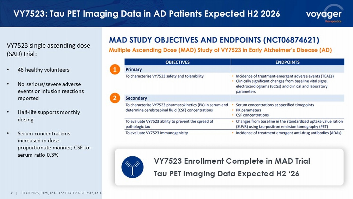 1 DeVos, et.al. Science Translational Medicine. 2017. 2 Exploratory clinical outcomes from BIIB080 (MAPT ASO) phase 1b multiple ascending dose and long - term extension study in mild Al zheimer’s disease. N. Ziogas, et al. 3 Budd Haeberlein et al. J Prev Alz Dis 2022, 4 Van Dyck et al. NEJM 2023. * CDR - SB effect size estimated by comparison to a matched external natural history cohort and matched placebo cohort from distinct studies and reflect possible but not confirmed clinical effect. ** Caution should be taken when making cross - trial comparisons. 8 | BIIB080 Sets Expectations for Tau Knockdown Approach BIIB080 (ASO knockdown, Biogen): • Reduced mRNA 50 - 75% 1 in NHP • Reduced tau per tau PET imaging in clinic • Impacted CDR - SB in exploratory analysis Initial data from Ph1b trial. Exploratory analyses also showed 2.04 - 2.44 slowing of decline in CDR - SB, greater than observed change with anti - amyloid antibodies (~0.5 point). 2,3,4, * Data from BIIB080 Phase 2 trial in 400+ AD patients expected mid - 2026 could validate tau knockdown approach if it demonstrates: 1. CDR - SB treatment effect better than anti - amyloid antibodies (~0.5 point)** 2. Correlation between tau PET imaging reduction and improvement on clinical symptoms VY1706 differentiation from BIIB080 BIIB080 = repeated intrathecal injection VY1706 = one - time intravenous; broad biodistribution