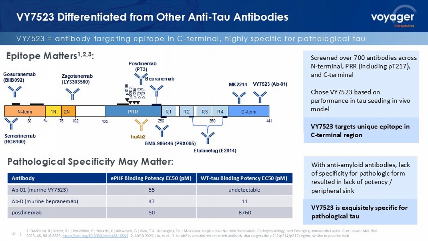 VY7523 Differentiated from Other Anti - Tau Antibodies VY7523 = antibody targeting epitope in C - terminal, highly specific for pathological tau 10 | Epitope Matters 1,2,3 : Pathological Specificity May Matter: 1. Davidson, R.; Krider, R.I.; Borsellino, P.; Noorda, K.; Alhwayek , G.; Vida, T.A. Untangling Tau: Molecular Insights into Neuroinflammation, Pathophysiology, and Emerging Immunotherapies. Cu rr. Issues Mol. Biol. 2023, 45, 8816 - 8839. https://doi.org/10.3390/cimb45110553 . 2. ADPD 2025, Liu, et al.. 3. huAb2 is a murinized research antibody that targets the p212/p214/p217 region, similar to posdinemab 30 45 250 350 VY 7523 ( Ab - 01 ) N - term 1N 2N PRR R1 R3 R4 R2 C - term pS199 pS202, pT205 pT212 pT217 441 75 102 165 Posdinemab (PT3) B epranemab BMS - 986446 (PRX005) Etalanetug ( E2814) Screened over 700 antibodies across N - terminal, PRR (including pT217), and C - terminal Chose VY7523 based on performance in tau seeding in vivo model VY7523 targets unique epitope in C - terminal region With anti - amyloid antibodies, lack of specificity for pathologic form resulted in lack of potency / peripheral sink VY7523 is exquisitely specific for pathological tau Gosuranemab (BIIB092) Semorinemab (RG6100) Zagotenemab (LY3303560) MK2214 WT - tau Binding Potency EC50 ( pM ) ePHF Binding Potency EC50 ( pM ) Antibody undetectable 55 Ab - 01 (murine VY7523) 11 47 Ab - D (murine bepranemab ) 8760 50 posdinemab huAb2