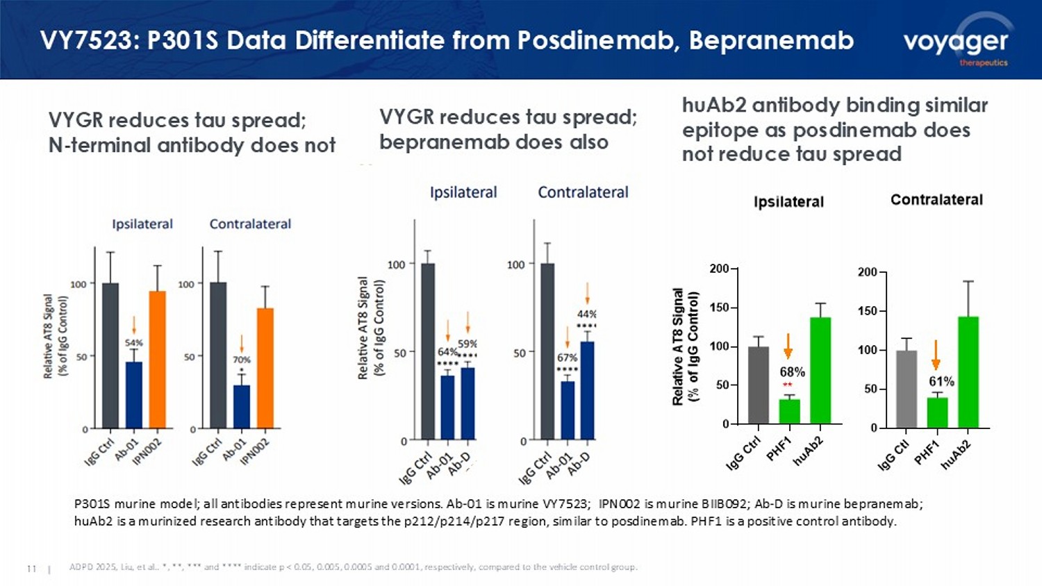 11 | VY7523: P301S Data Differentiate from Posdinemab , Bepranemab VYGR reduces tau spread; N - terminal antibody does not P301S murine model; all antibodies represent murine versions. Ab - 01 is murine VY7523; IPN002 is murine BIIB092; Ab - D is murine bepranemab ; huAb2 is a murinized research antibody that targets the p212/p214/p217 region, similar to posdinemab . PHF1 is a positive control antibody. VYGR reduces tau spread; bepranemab does also ADPD 2025, Liu, et al.. *, **, *** and **** indicate p < 0.05, 0.005, 0.0005 and 0.0001, respectively, compared to the vehicl e c ontrol group. huAb2 antibody binding similar epitope as posdinemab does not reduce tau spread I g G C t l P H F 1 h u A b 2 0 50 100 150 200 Contralateral 61% I g G C t r l P H F 1 h u A b 2 0 50 100 150 200 Ipsilateral R e l a t i v e A T 8 S i g n a l ( % o f I g G C o n t r o l ) ** 68%