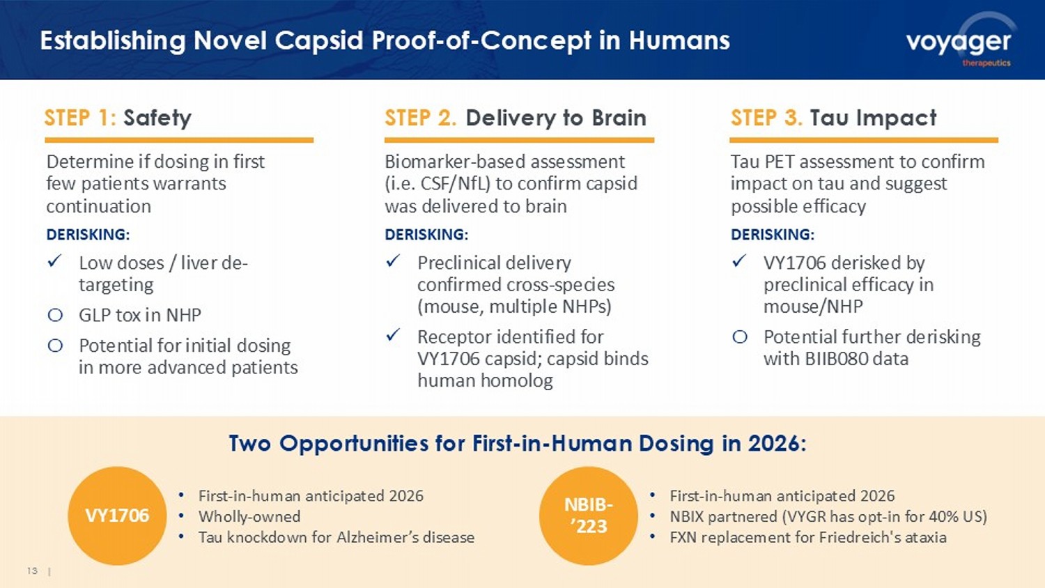 13 | Establishing Novel Capsid Proof - of - Concept in Humans STEP 1: Safety STEP 2. Delivery to Brain STEP 3. Tau Impact Determine if dosing in first few patients warrants continuation DERISKING: x Low doses / liver de - targeting o GLP tox in NHP o Potential for initial dosing in more advanced patients Biomarker - based assessment (i.e. CSF/ NfL ) to confirm capsid was delivered to brain DERISKING: x Preclinical delivery confirmed cross - species (mouse, multiple NHPs) x Receptor identified for VY1706 capsid; capsid binds human homolog Tau PET assessment to confirm impact on tau and suggest possible efficacy DERISKING: x VY1706 derisked by preclinical efficacy in mouse/NHP o Potential further derisking with BIIB080 data Two Opportunities for First - in - Human Dosing in 2026: • First - in - human anticipated 2026 • Wholly - owned • Tau knockdown for Alzheimer’s disease • First - in - human anticipated 2026 • NBIX partnered (VYGR has opt - in for 40% US) • FXN replacement for Friedreich's ataxia VY1706 NBIB - ’223