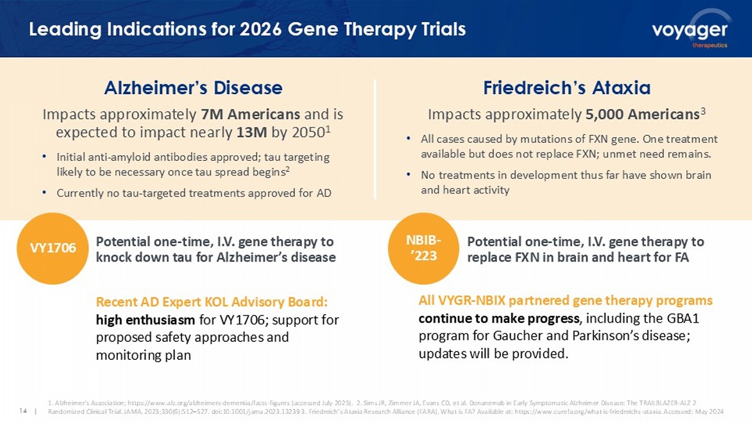 14 | Leading Indications for 2026 Gene Therapy Trials Alzheimer’s Disease Impacts approximately 7M Americans and is expected to impact nearly 13M by 2050 1 • Initial anti - amyloid antibodies approved; tau targeting likely to be necessary once tau spread begins 2 • Currently no tau - targeted treatments approved for AD Potential one - time, I.V. gene therapy to knock down tau for Alzheimer’s disease Recent AD Expert KOL Advisory Board: high enthusiasm for VY1706; support for proposed safety approaches and monitoring plan Potential one - time, I.V. gene therapy to replace FXN in brain and heart for FA All VYGR - NBIX partnered gene therapy programs continue to make progress , including the GBA1 program for Gaucher and Parkinson’s disease; updates will be provided. 1. Alzheimer's Association; https://www.alz.org/alzheimers - dementia/facts - figures (accessed July 2025). 2. Sims JR, Zimmer JA, Evans CD, et al. Donanemab in Early Symptomatic Alzheimer Disease: The TRAILBLAZER - ALZ 2 Randomized Clinical Trial. JAMA. 2023;330(6):512 – 527. doi:10.1001/jama.2023.13239 3. Friedreich’s Ataxia Research Alliance (FARA ). What is FA? Available at: https://www.curefa.org/what - is - friedreichs - ataxia. Accessed: May 2024 Friedreich’s Ataxia Impacts approximately 5,000 Americans 3 • All cases caused by mutations of FXN gene. One treatment available but does not replace FXN; unmet need remains. • No treatments in development thus far have shown brain and heart activity VY1706 NBIB - ’223