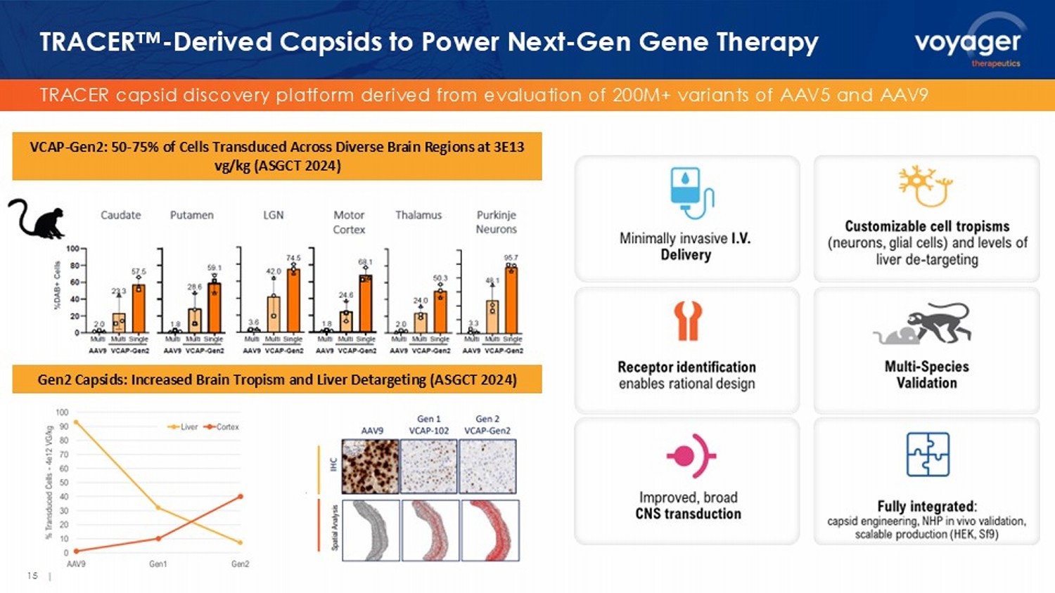 TRACER capsid discovery platform derived from evaluation of 200M+ variants of AAV5 and AAV9 TRACER - Derived Capsids to Power Next - Gen Gene Therapy 15 | VCAP - Gen2: 50 - 75% of Cells Transduced Across Diverse Brain Regions at 3E13 vg/kg (ASGCT 2024) Gen2 Capsids: Increased Brain Tropism and Liver Detargeting (ASGCT 2024)