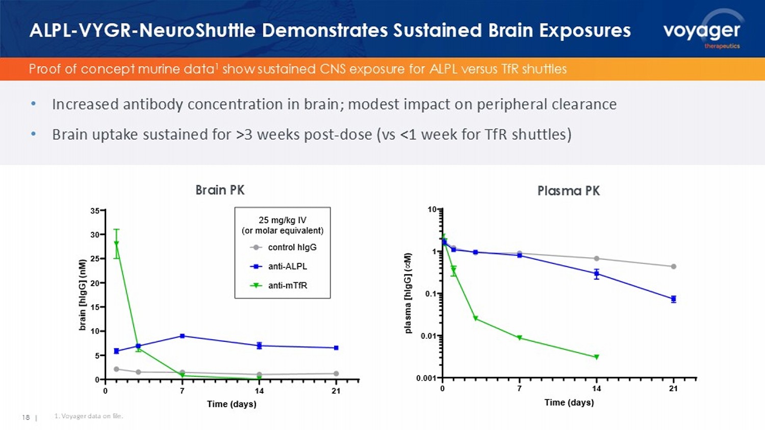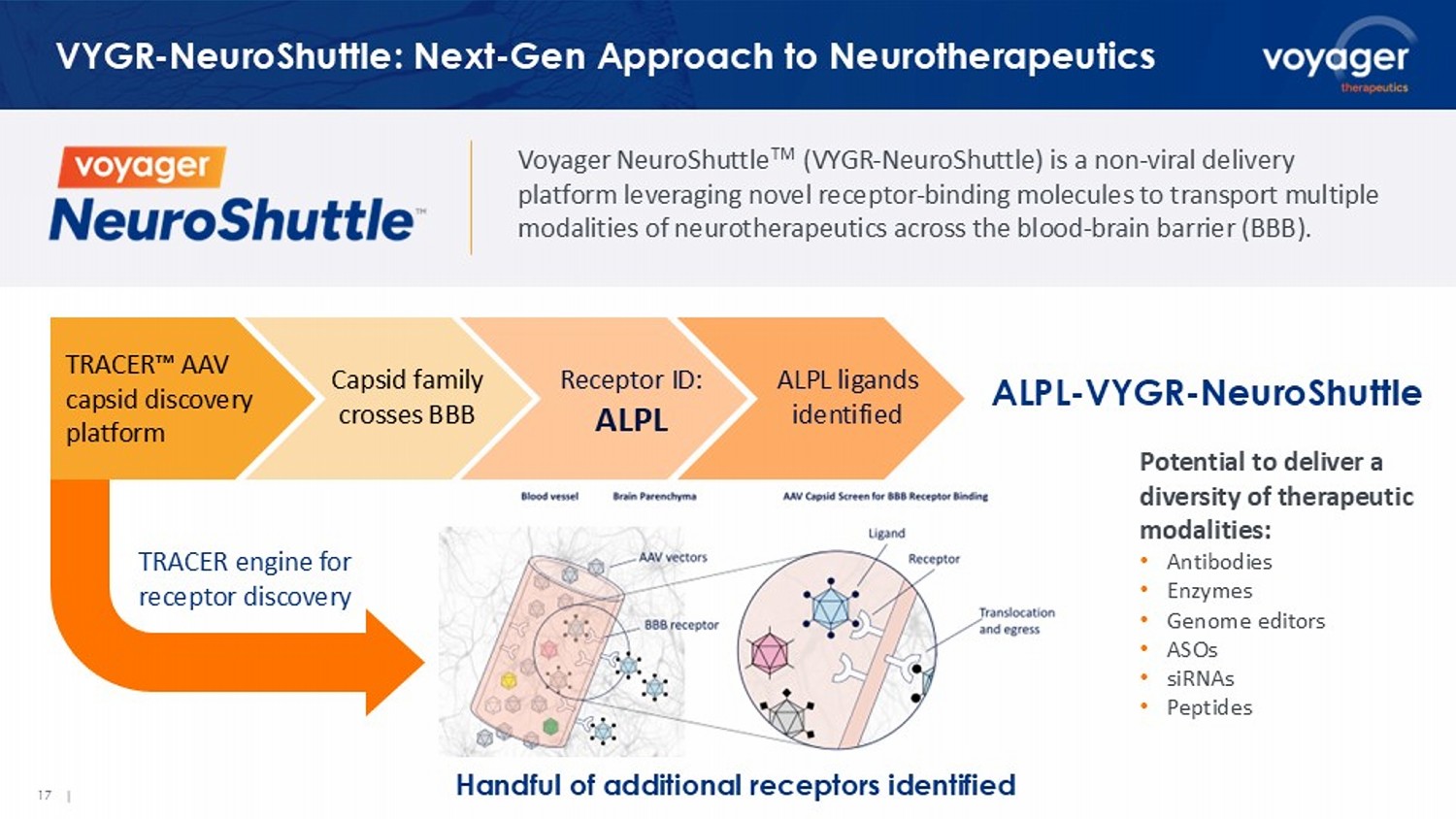 17 | VYGR - NeuroShuttle : Next - Gen Approach to Neurotherapeutics TRACER AAV capsid discovery platform ALPL - VYGR - NeuroShuttle Handful of additional receptors identified Potential to deliver a diversity of therapeutic modalities: • Antibodies • Enzymes • Genome editors • ASOs • siRNAs • Peptides Voyager NeuroShuttle TM (VYGR - NeuroShuttle ) is a non - viral delivery platform leveraging novel receptor - binding molecules to transport multiple modalities of neurotherapeutics across the blood - brain barrier (BBB). Capsid family crosses BBB Receptor ID: ALPL ALPL ligands identified TRACER engine for receptor discovery