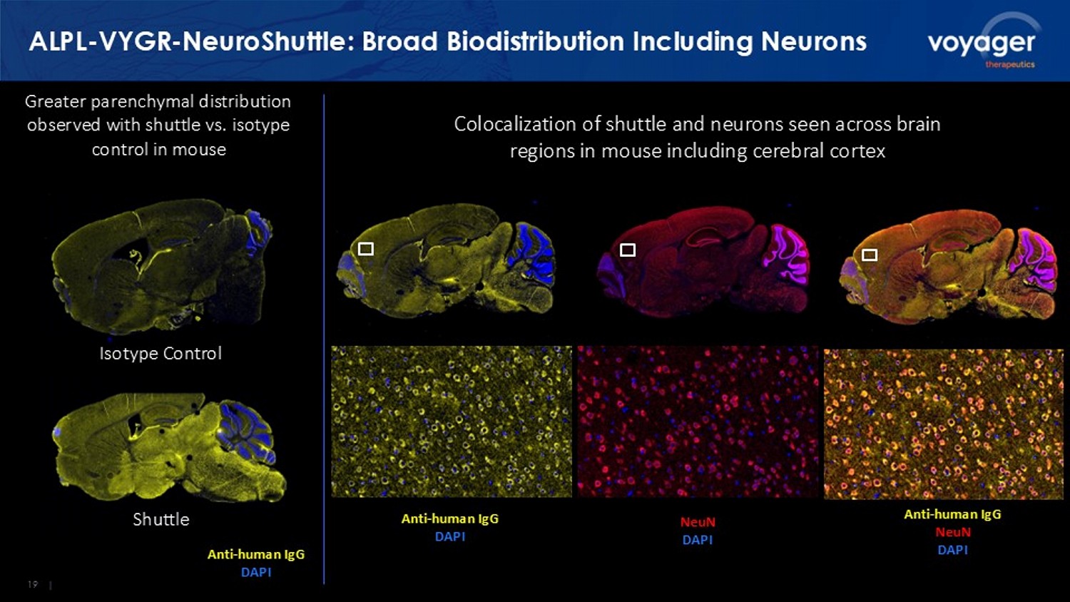 19 | ALPL - VYGR - NeuroShuttle : Broad Biodistribution Including Neurons Anti - human IgG DAPI Anti - human IgG DAPI Anti - human IgG NeuN DAPI Colocalization of shuttle and neurons seen across brain regions in mouse including cerebral cortex Greater parenchymal distribution observed with shuttle vs. isotype control in mouse NeuN DAPI Isotype Control Shuttle