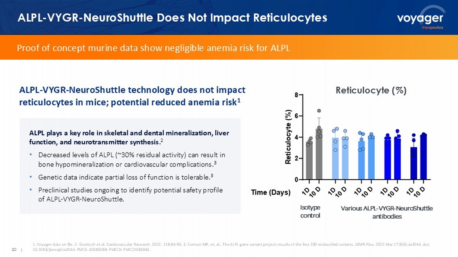 20 | ALPL - VYGR - NeuroShuttle Does Not Impact Reticulocytes 1. Voyager data on file. 2. Goettsch et al. Cardiovascular Research. 2022. 118:84 - 96. 3. Farman MR, et. al., The ALPL gene variant project: results of the f irst 100 reclassified variants. JBMR Plus. 2025 Mar 17;9(6):ziaf044. doi : 10.1093/ jbmrpl /ziaf044. PMID: 40386289; PMCID: PMC12083982. ALPL plays a key role in skeletal and dental mineralization, liver function, and neurotransmitter synthesis. 2 • Decreased levels of ALPL (~30% residual activity) can result in bone hypomineralization or cardiovascular complications. 3 • Genetic data indicate partial loss of function is tolerable. 3 • Preclinical studies ongoing to identify potential safety profile of ALPL - VYGR - NeuroShuttle . Proof of concept murine data show negligible anemia risk for ALPL ALPL - VYGR - NeuroShuttle technology does not impact reticulocytes in mice; potential reduced anemia risk 1 Reticulocyte (%)      7L P H  ' D \ V 5 H W L F X O R F \WH   9DULRXV$/3/  1HXUR6KXWWOH DQWLERGLHV ,VRW\SH FQWU Various ALPL - VYGR - NeuroShuttle antibodies Isotype control
