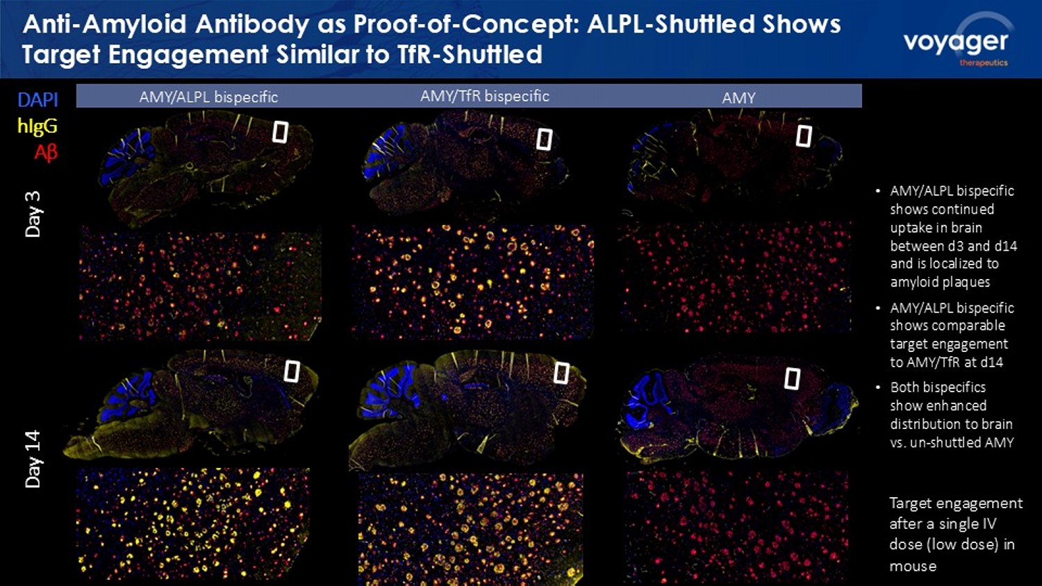 Anti - Amyloid Antibody as Proof - of - Concept: ALPL - Shuttled Shows Target Engagement Similar to TfR - Shuttled DAPI hIgG Aβ Day 3 Day 14 AMY/ALPL bispecific AMY/ TfR bispecific AMY • AMY/ALPL bispecific shows continued uptake in brain between d3 and d14 and is localized to amyloid plaques • AMY/ALPL bispecific shows comparable target engagement to AMY/ TfR at d14 • Both bispecifics show enhanced distribution to brain vs. un - shuttled AMY Target engagement after a single IV dose (low dose) in mouse