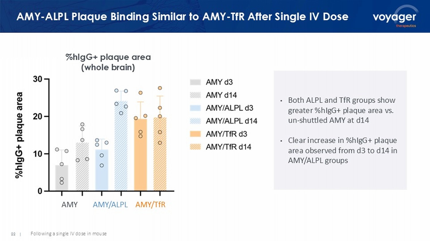 22 | AMY - ALPL Plaque Binding Similar to AMY - TfR After Single IV Dose % hIgG + plaque area (whole brain) • Both ALPL and TfR groups show greater % hIgG + plaque area vs. un - shuttled AMY at d14 • Clear increase in % hIgG + plaque area observed from d3 to d14 in AMY/ALPL groups AMY AMY/ALPL AMY/ TfR Following a single IV dose in mouse