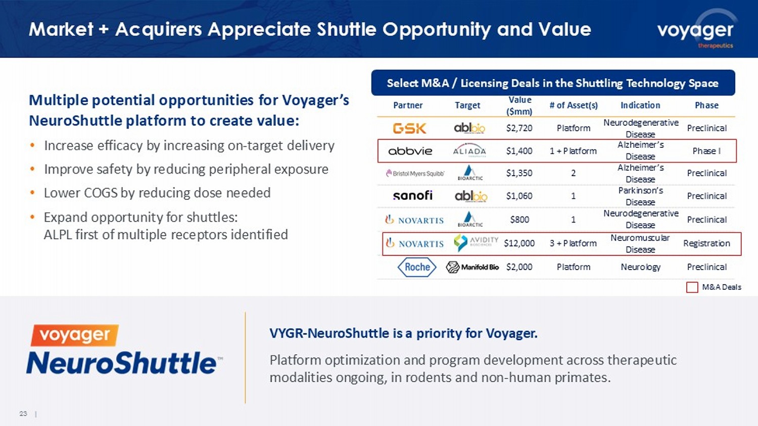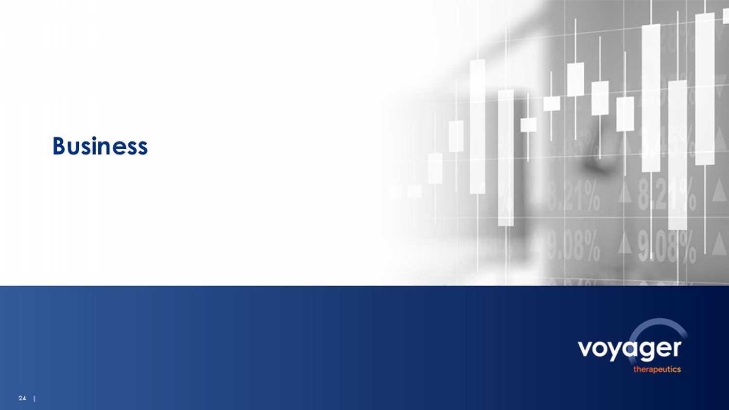23 | Market + Acquirers Appreciate Shuttle Opportunity and Value Multiple potential opportunities for Voyager’s NeuroShuttle platform to create value: • Increase efficacy by increasing on - target delivery • Improve safety by reducing peripheral exposure • Lower COGS by reducing dose needed • Expand opportunity for shuttles: ALPL first of multiple receptors identified VYGR - NeuroShuttle is a priority for Voyager. Platform optimization and program development across therapeutic modalities ongoing, in rodents and non - human primates. Phase Indication # of Asset(s) Value ($mm) Target Partner Preclinical Neurodegenerative Disease Platform $2,720 Phase I Alzheimer’s Disease 1 + Platform $1,400 Preclinical Alzheimer’s Disease 2 $1,350 Preclinical Parkinson’s Disease 1 $1,060 Preclinical Neurodegenerative Disease 1 $800 Registration Neuromuscular Disease 3 + Platform $12,000 Preclinical Neurology Platform $2,000 Select M&A / Licensing Deals in the Shuttling Technology Space M&A Deals