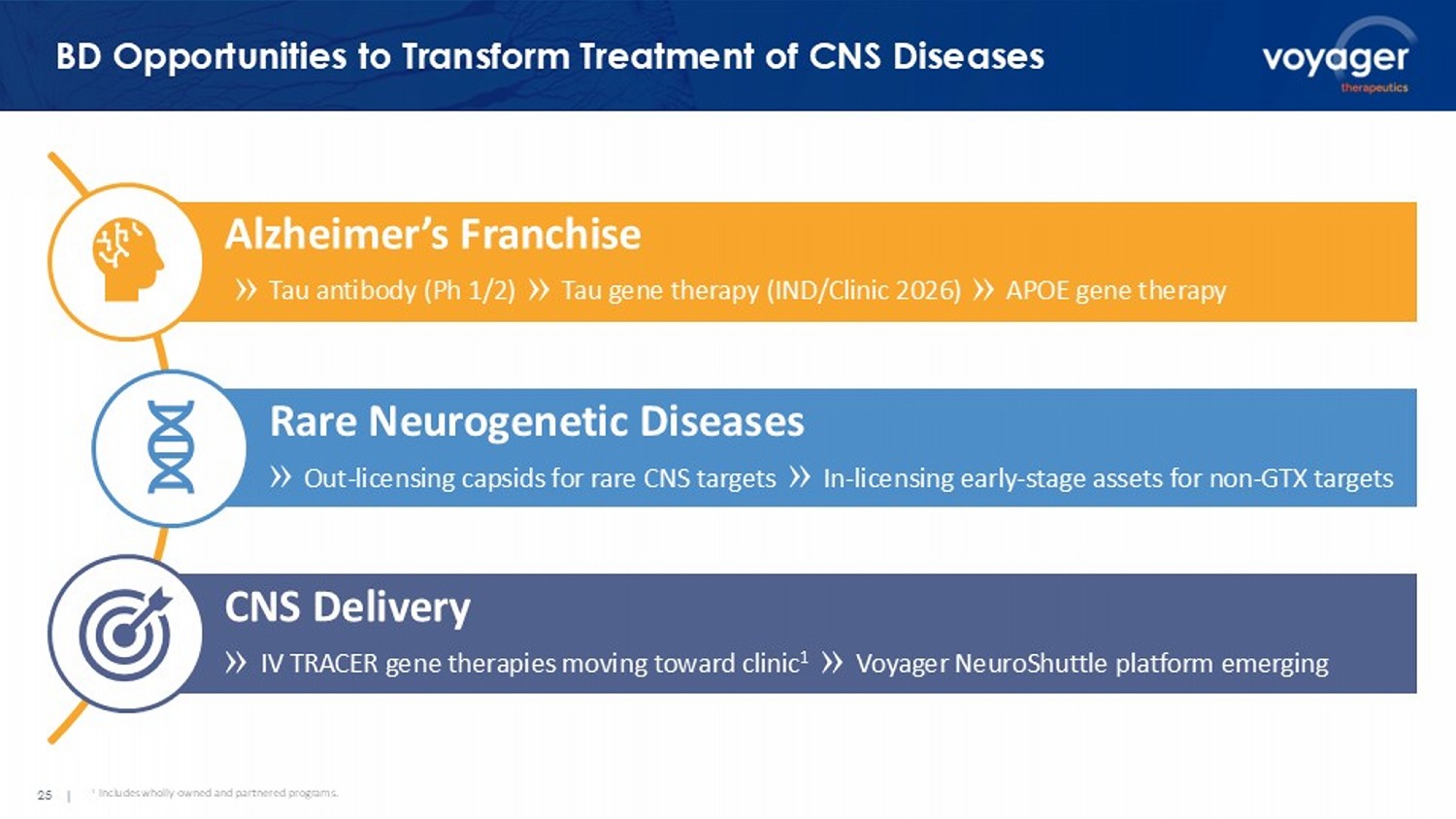 25 | Alzheimer’s Franchise » Tau antibody (Ph 1/2) » Tau gene therapy (IND/Clinic 2026) » APOE gene therapy Rare Neurogenetic Diseases » Out - licensing capsids for rare CNS targets » In - licensing early - stage assets for non - GTX targets CNS Delivery » IV TRACER gene therapies moving toward clinic 1 » Voyager NeuroShuttle platform emerging BD Opportunities to Transform Treatment of CNS Diseases 1 I ncludes wholly - owned and partnered programs .