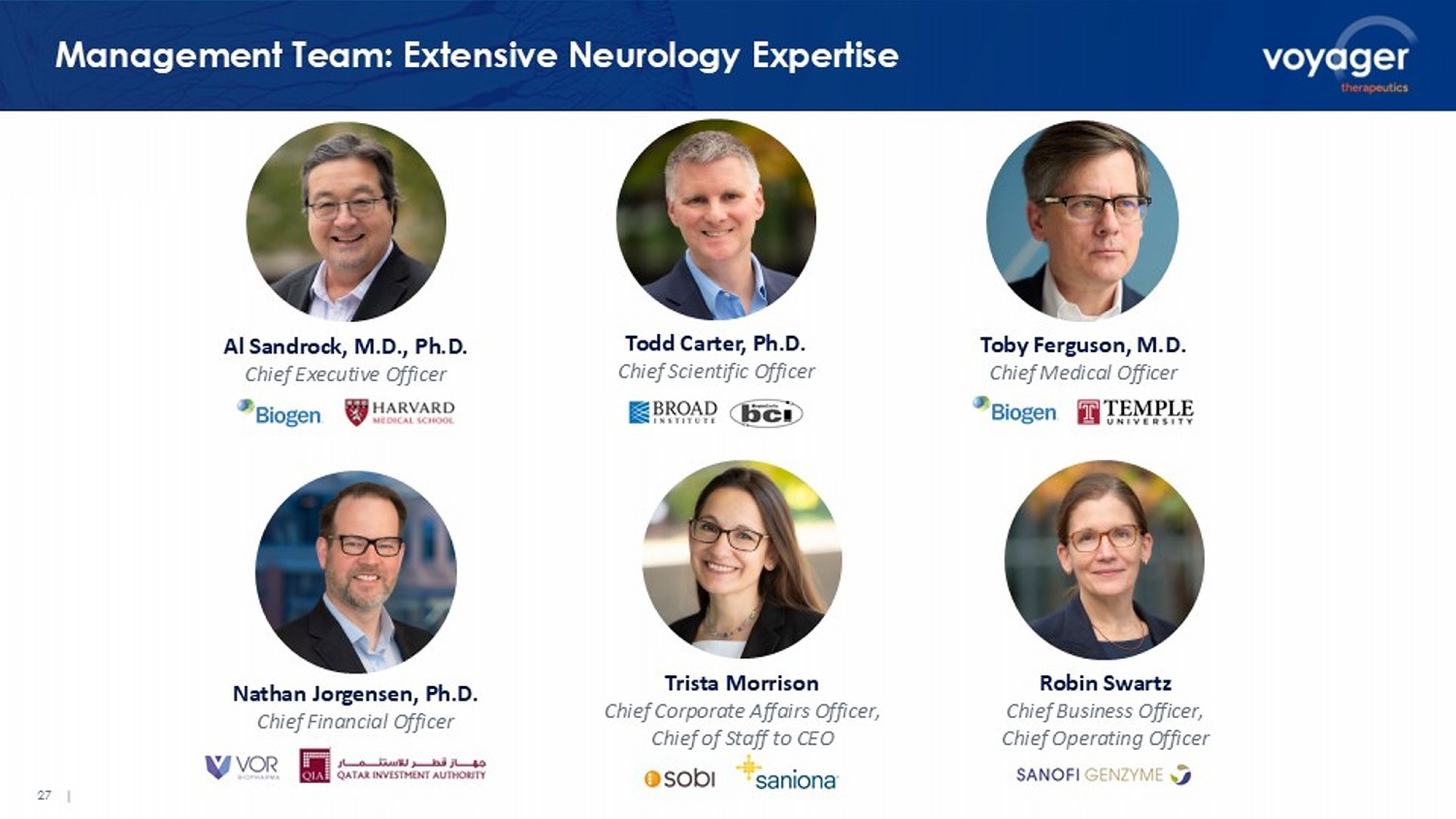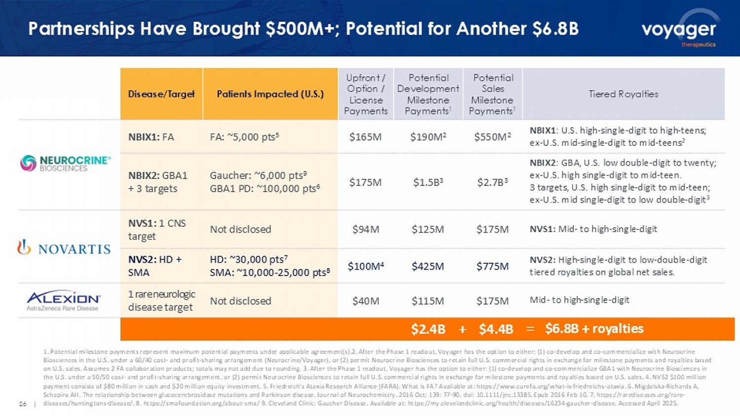 26 | Partnerships Have Brought $500M+; Potential for Another $6.8B Tiered Royalties Potential Sales Milestone Payments 1 Potential Development Milestone Payments 1 Upfront / Option / License Payments Patients Impacted (U.S.) Disease/Target NBIX1 : U.S. high - single - digit to high - teens; ex - U.S. mid - single - digit to mid - teens 2 $550M 2 $190M 2 $165M FA: ~5,000 pts 5 NBIX1: FA NBIX2 : GBA , U.S. low double - digit to twenty; ex - U.S. high single - digit to mid - teen. 3 targets, U.S. high single - digit to mid - teen; ex - U.S. mid single - digit to low double - digit 3 $2.7B 3 $1.5B 3 $175M Gaucher: ~6,000 pts 9 GBA1 PD: ~100,000 pts 6 NBIX2: GBA1 + 3 targets NVS1: Mid - to high - single - digit $175M $125M $94M Not disclosed NVS1: 1 CNS target NVS2: High - single - digit to low - double - digit tiered royalties on global net sales. $775M $425M $100M 4 HD: ~30,000 pts 7 SMA: ~10,000 - 25,000 pts 8 NVS2: HD + SMA Mid - to high - single - digit $175M $115M $40M Not disclosed 1 rare neurologic disease target 1. Potential milestone payments represent maximum potential payments under applicable agreement(s).2. After the Phase 1 reado ut, Voyager has the option to either: (1) co - develop and co - commercialize with Neurocrine Biosciences in the U.S. under a 60/40 cost - and profit - sharing arrangement (Neurocrine/Voyager), or (2) permit Neurocrine Biosci ences to retain full U.S. commercial rights in exchange for milestone payments and royalties based on U.S. sales. Assumes 2 FA collaboration products; totals may not add due to rounding. 3. After the Phase 1 readout, Voyager ha s the option to either: (1) co - develop and co - commercialize GBA1 with Neurocrine Biosciences in the U.S. under a 50/50 cost - and profit - sharing arrangement, or (2) permit Neurocrine Biosciences to retain full U.S. commercial rights in exchange for milestone payments and royalties based on U.S. sales. 4. NVS2 $100 million payment consists of $80 million in cash and $20 million equity investment. 5. Friedreich’s Ataxia Research Alliance (FARA). W hat is FA? Available at: https://www.curefa.org/what - is - friedreichs - ataxia. 6. Migdalska - Richards A, Schapira AH. The relationship between glucocerebrosidase mutations and Parkinson disease. Journal of Neurochemistry. 2016 Oct; 139: 77 - 9 0. doi : 10.1111/jnc.13385. Epub 2016 Feb 10. 7. https://rarediseases.org/rare - diseases/huntingtons - disease/. 8. https://smafoundation.org/about - sma/ 9. Cleveland Clinic: Gaucher Disease. Available at: https ://my.clevelandclinic.org/health/diseases/16234 - gaucher - disease. Accessed April 2025. $2.4B $ 4.4 B + = $ 6.8 B + royalties