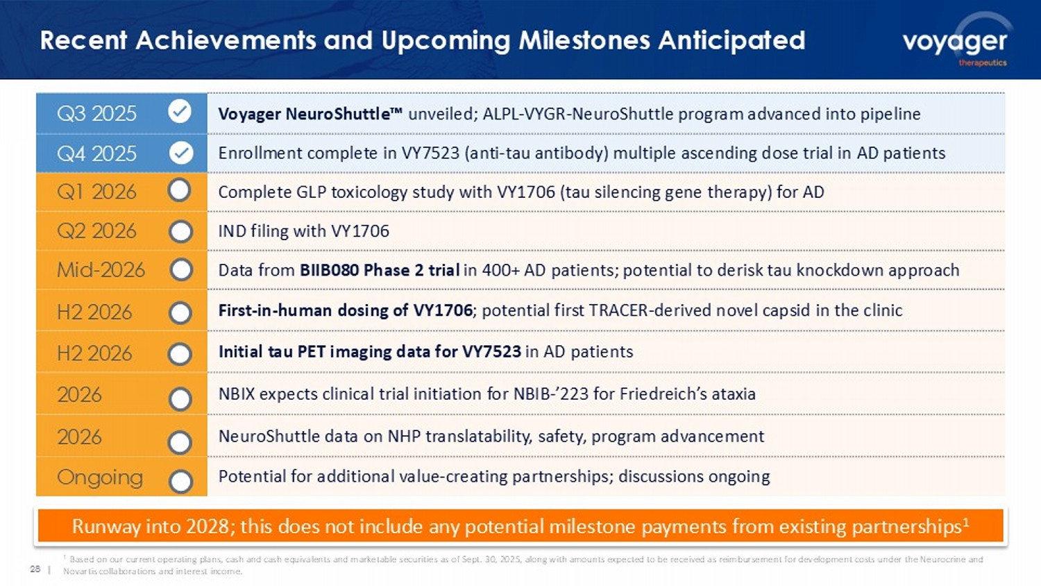 Recent Achievements and Upcoming Milestones Anticipated Voyager NeuroShuttle unveiled; ALPL - VYGR - NeuroShuttle program advanced into pipeline Q3 2025 Enrollment complete in VY7523 (anti - tau antibody) multiple ascending dose trial in AD patients Q4 2025 Complete GLP toxicology study with VY1706 (tau silencing gene therapy) for AD Q1 2026 IND filing with VY1706 Q2 2026 Data from BIIB080 Phase 2 trial in 400+ AD patients; potential to derisk tau knockdown approach Mid - 2026 First - in - human dosing of VY1706 ; potential first TRACER - derived novel capsid in the clinic H2 2026 Initial tau PET imaging data for VY7523 in AD patients H2 2026 NBIX expects clinical trial initiation for NBIB - ’223 for Friedreich’s ataxia 2026 NeuroShuttle data on NHP translatability, safety, program advancement 2026 Potential for additional value - creating partnerships; discussions ongoing Ongoing 28 | 1 Based on our current operating plans, cash and cash equivalents and marketable securities as of Sept. 30, 2025, along with am ou nts expected to be received as reimbursement for development costs under the Neurocrine and Novartis collaborations and interest income. Runway into 2028; this does not include any potential milestone payments from existing partnerships 1