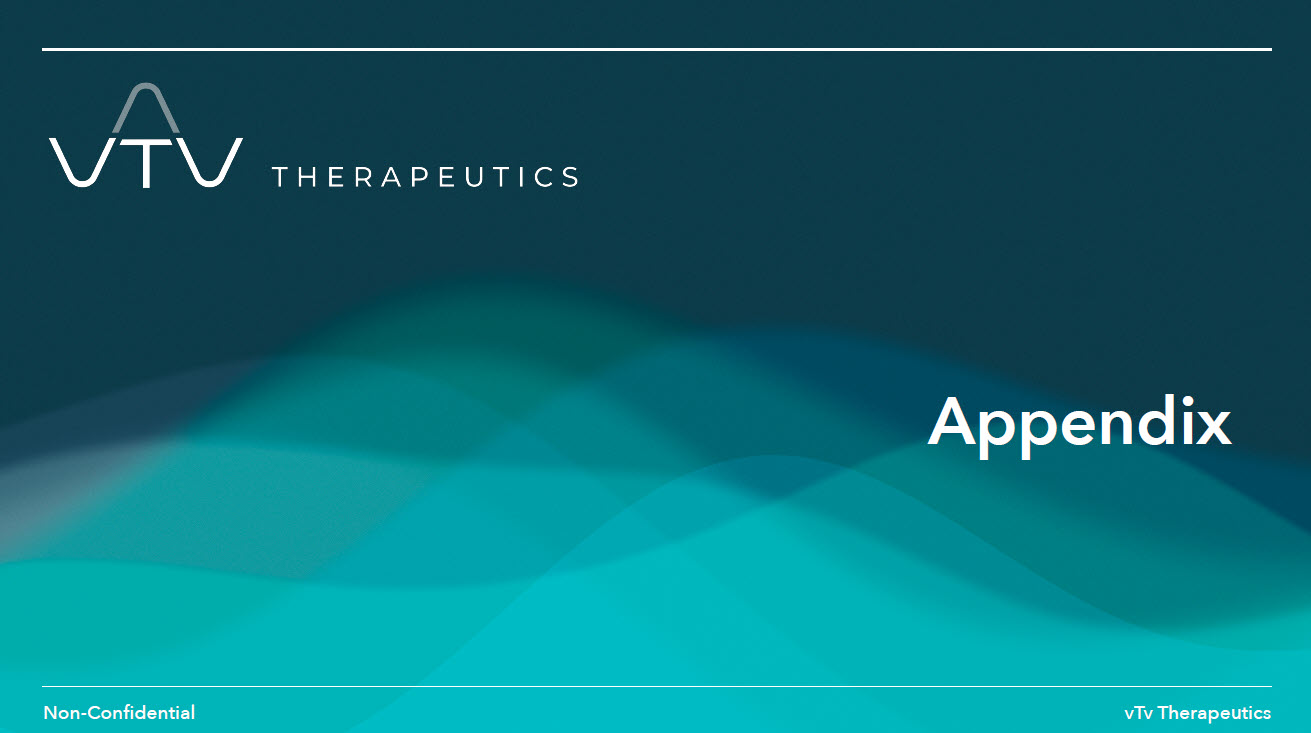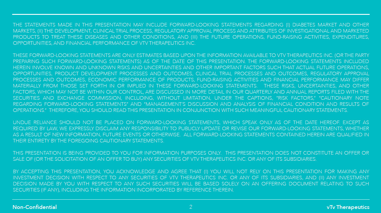 THE STATEMENTS MADE IN THIS PRESENTATION MAY INCLUDE FORWARD - LOOKING STATEMENTS REGARDING (I) DIABETES MARKET AND OTHER MARKETS, (II) THE DEVELOPMENT, CLINICAL TRIAL PROCESS, REGULATORY APPROVAL PROCESS AND ATTRIBUTES OF INVESTIGATIONAL AND MARKETED PRODUCTS TO TREAT THESE DISEASES AND OTHER CONDITIONS, AND (III) THE FUTURE OPERATIONS, FUND - RAISING ACTIVITIES, EXPENDITURES, OPPORTUNITIES, AND FINANCIAL PERFORMANCE OF VTV THERAPEUTICS INC . THESE FORWARD - LOOKING STATEMENTS ARE ONLY ESTIMATES BASED UPON THE INFORMATION AVAILABLE TO VTV THERAPEUTICS INC . (OR THE PARTY PREPARING SUCH FORWARD - LOOKING STATEMENTS) AS OF THE DATE OF THIS PRESENTATION . THE FORWARD - LOOKING STATEMENTS INCLUDED HEREIN INVOLVE KNOWN AND UNKNOWN RISKS AND UNCERTAINTIES AND OTHER IMPORTANT FACTORS SUCH THAT ACTUAL FUTURE OPERATIONS, OPPORTUNITIES, PRODUCT DEVELOPMENT PROCESSES AND OUTCOMES, CLINICAL TRIAL PROCESSES AND OUTCOMES, REGULATORY APPROVAL PROCESSES AND OUTCOMES, ECONOMIC PERFORMANCE OF PRODUCTS, FUND - RAISING ACTIVITIES AND FINANCIAL PERFORMANCE MAY DIFFER MATERIALLY FROM THOSE SET FORTH IN OR IMPLIED IN THESE FORWARD - LOOKING STATEMENTS . THESE RISKS, UNCERTAINTIES, AND OTHER FACTORS, WHICH MAY NOT BE WITHIN OUR CONTROL, ARE DISCUSSED IN MORE DETAIL IN OUR QUARTERLY AND ANNUAL REPORTS FILED WITH THE SECURITIES AND EXCHANGE COMMISSION, INCLUDING, WITHOUT LIMITATION, UNDER THE CAPTIONS, “RISK FACTORS,” “CAUTIONARY NOTE REGARDING FORWARD - LOOKING STATEMENTS” AND “MANAGEMENT’S DISCUSSION AND ANALYSIS OF FINANCIAL CONDITION AND RESULTS OF OPERATIONS . ” THEREFORE, YOU SHOULD READ THIS PRESENTATION IN CONJUNCTION WITH SUCH MEANINGFUL CAUTIONARY STATEMENTS . UNDUE RELIANCE SHOULD NOT BE PLACED ON FORWARD - LOOKING STATEMENTS, WHICH SPEAK ONLY AS OF THE DATE HEREOF . EXCEPT AS REQUIRED BY LAW, WE EXPRESSLY DISCLAIM ANY RESPONSIBILITY TO PUBLICLY UPDATE OR REVISE OUR FORWARD - LOOKING STATEMENTS, WHETHER AS A RESULT OF NEW INFORMATION, FUTURE EVENTS OR OTHERWISE . ALL FORWARD - LOOKING STATEMENTS CONTAINED HEREIN ARE QUALIFIED IN THEIR ENTIRETY BY THE FOREGOING CAUTIONARY STATEMENTS . THIS PRESENTATION IS BEING PROVIDED TO YOU FOR INFORMATION PURPOSES ONLY . THIS PRESENTATION DOES NOT CONSTITUTE AN OFFER OR SALE OF (OR THE SOLICITATION OF AN OFFER TO BUY) ANY SECURITIES OF VTV THERAPEUTICS INC . OR ANY OF ITS SUBSIDIARIES . BY ACCEPTING THIS PRESENTATION, YOU ACKNOWLEDGE AND AGREE THAT (I) YOU WILL NOT RELY ON THIS PRESENTATION FOR MAKING ANY INVESTMENT DECISION WITH RESPECT TO ANY SECURITIES OF VTV THERAPEUTICS INC . OR ANY OF ITS SUBSIDIARIES, AND (II) ANY INVESTMENT DECISION MADE BY YOU WITH RESPECT TO ANY SUCH SECURITIES WILL BE BASED SOLELY ON AN OFFERING DOCUMENT RELATING TO SUCH SECURITIES (IF ANY), INCLUDING THE INFORMATION INCORPORATED BY REFERENCE THEREIN . 2 Non - Confidential vTv Therapeutics