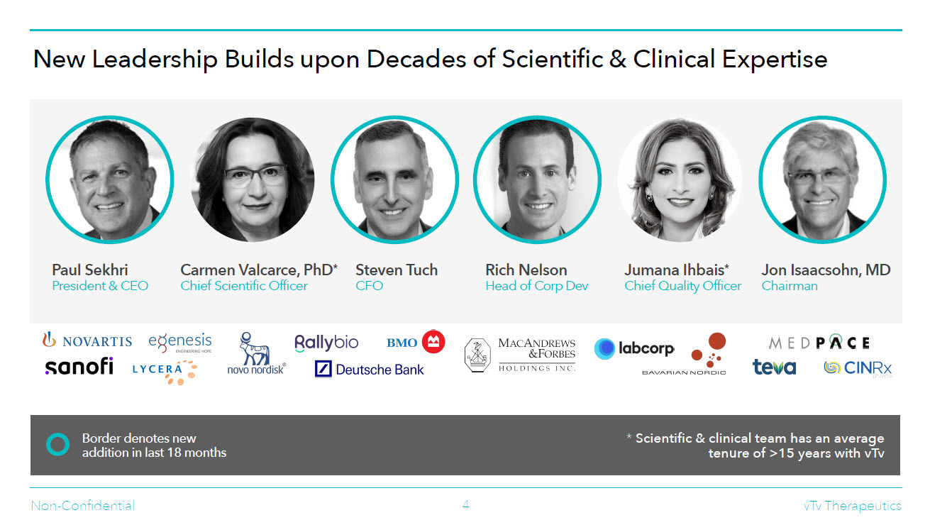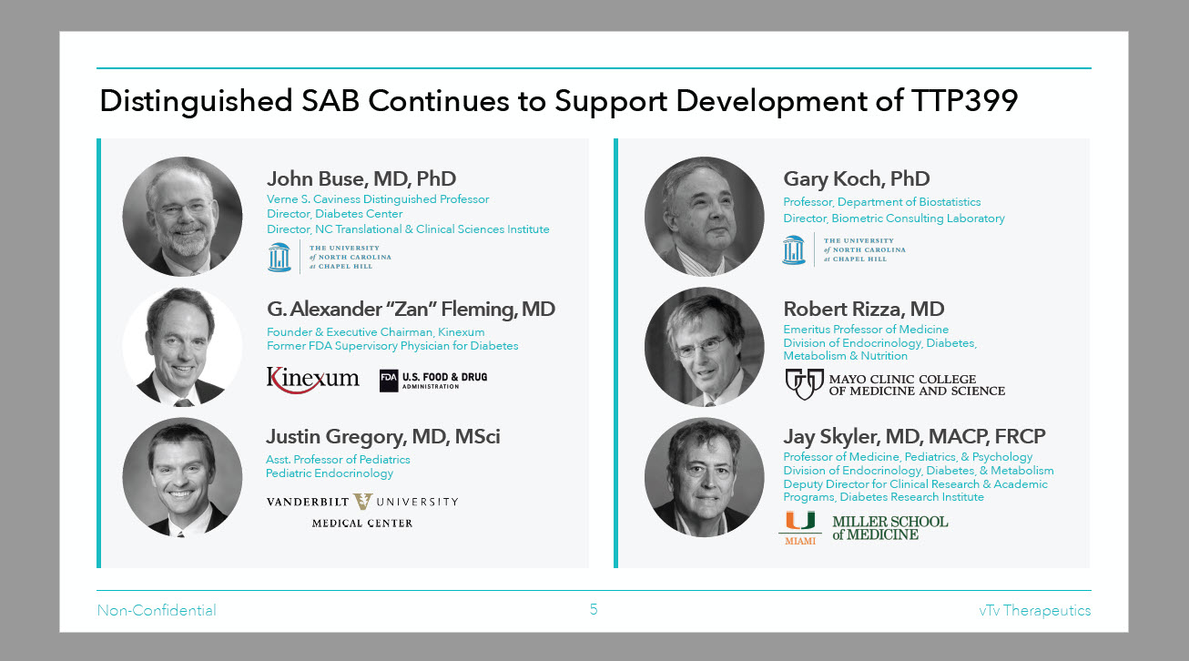 * Scientific & clinical team has an average tenure of >15 years with vTv New Leadership Builds upon Decades of Scientific & Clinical Expertise Carmen Valcarce, PhD * Chief Scientific Officer Paul Sekhri President & CEO Rich Nelson Head of Corp Dev Border denotes new addition in last 18 months Steven Tuch CFO Jumana Ihbais * Chief Quality Officer Jon Isaacsohn, MD Chairman 4 Non - Confidential vTv Therapeutics