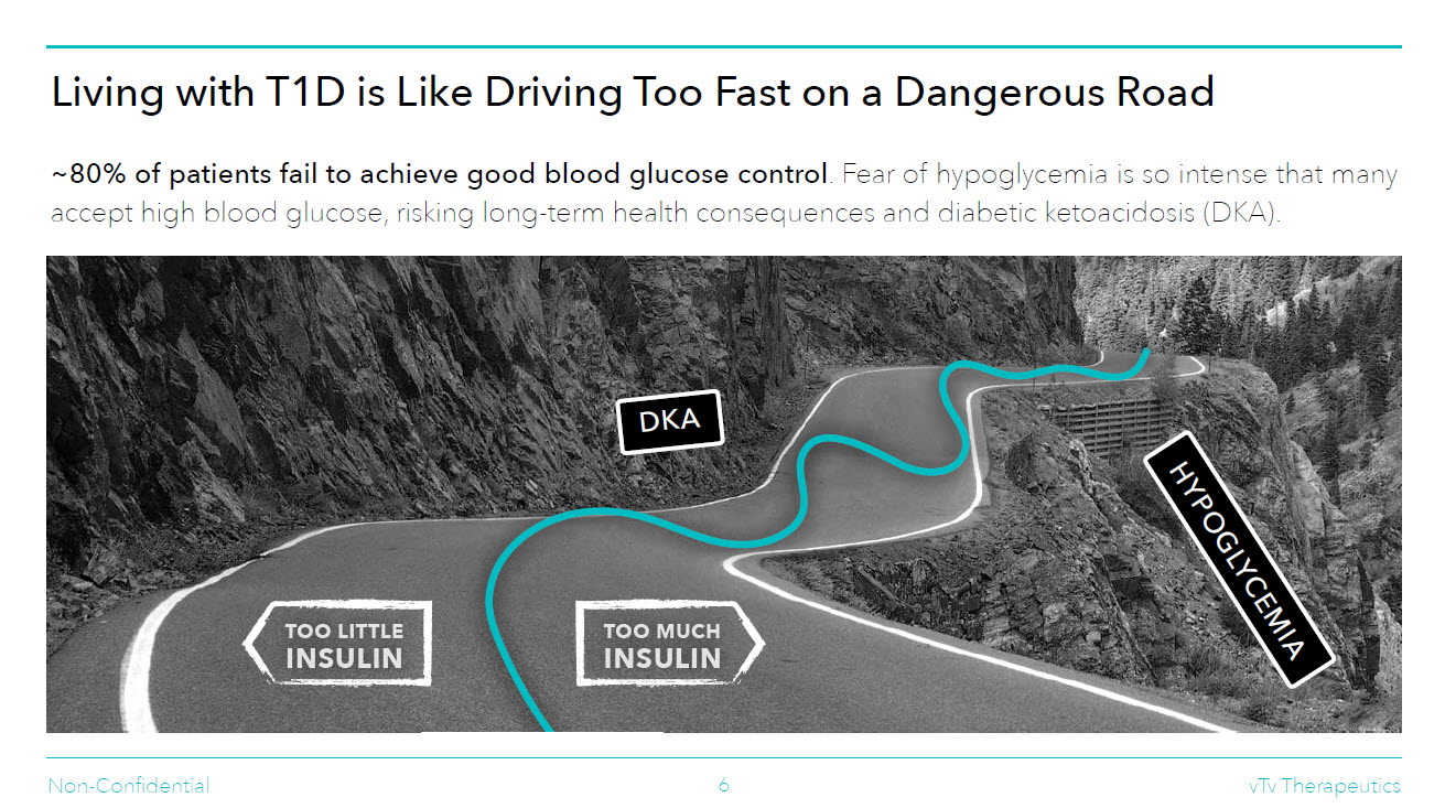 Living with T1D is Like Driving Too Fast on a Dangerous Road TOO MUCH INSULIN ~80% of patients fail to achieve good blood glucose control. Fear of hypoglycemia is so intense that many accept high blood glucose, risking long - term health consequences and diabetic ketoacidosis (DKA). TOO LITTLE INSULIN 6 Non - Confidential vTv Therapeutics