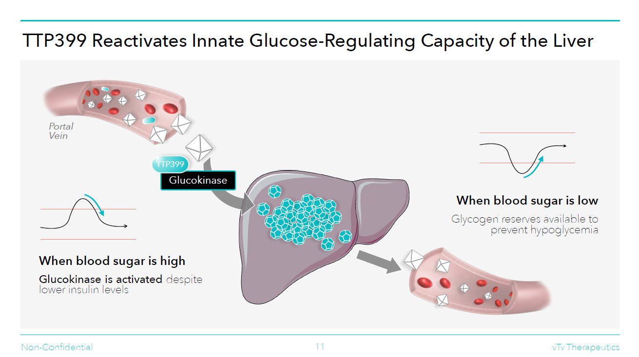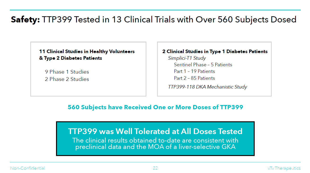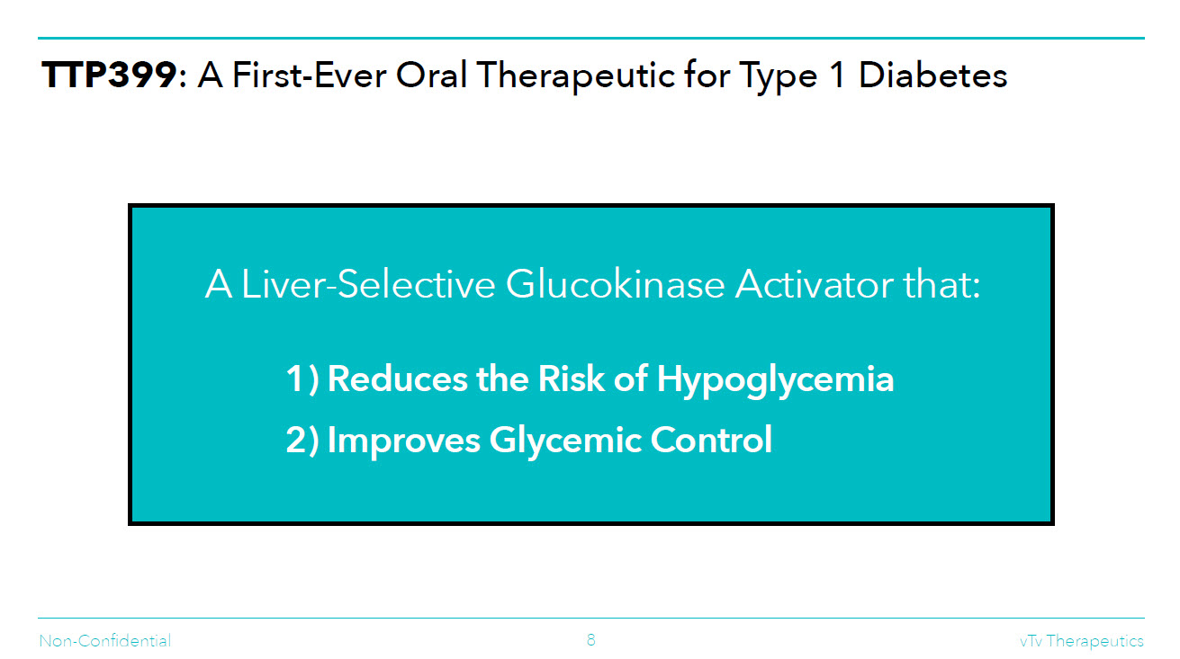 TTP399 : A First - Ever Oral Therapeutic for T yp e 1 Diabetes 8 Non - Confidential vTv Therapeutics A Liver - Selective Glucokinase Activator that: 1) Reduces the Risk of Hypoglycemia 2) Improves Glycemic Control