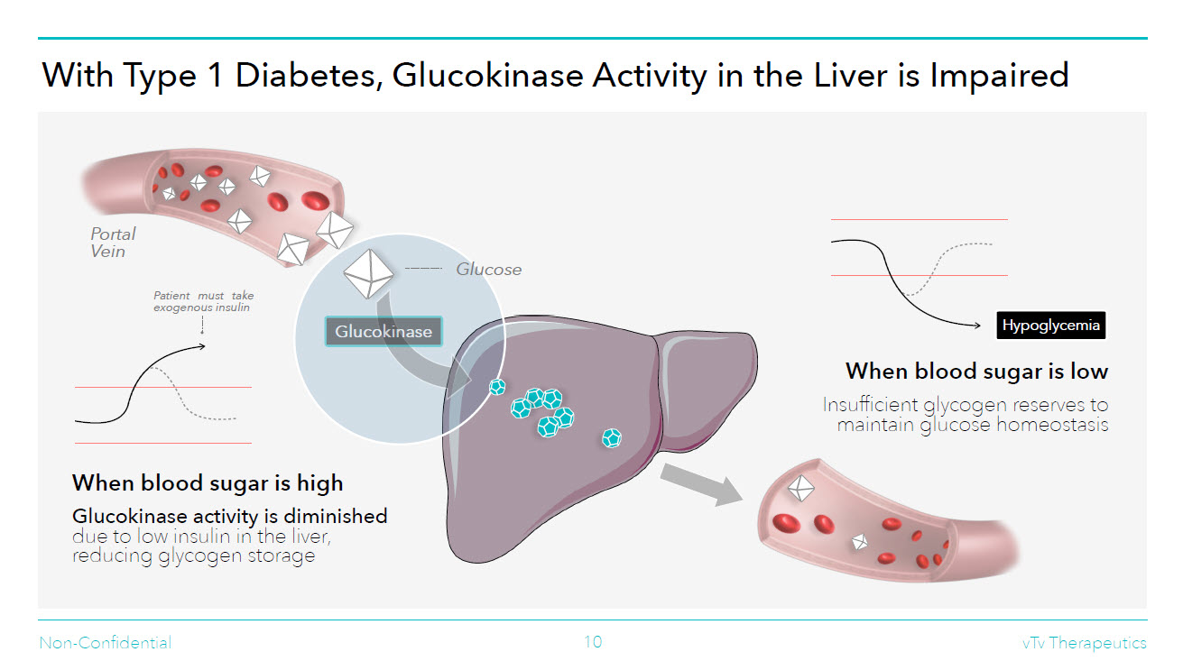 In Healthy Patients, the Liver Acts as a Reservoir for Glucose Glucokinase When blood sugar is high Glucokinase, in presence of insulin, converts some glucose into glycogen for storage Insulin Glucose 9 Non - Confidential vTv Therapeutics When blood sugar is low Glycogen reserves are broken down into glucose for release Glycogen Portal Vein