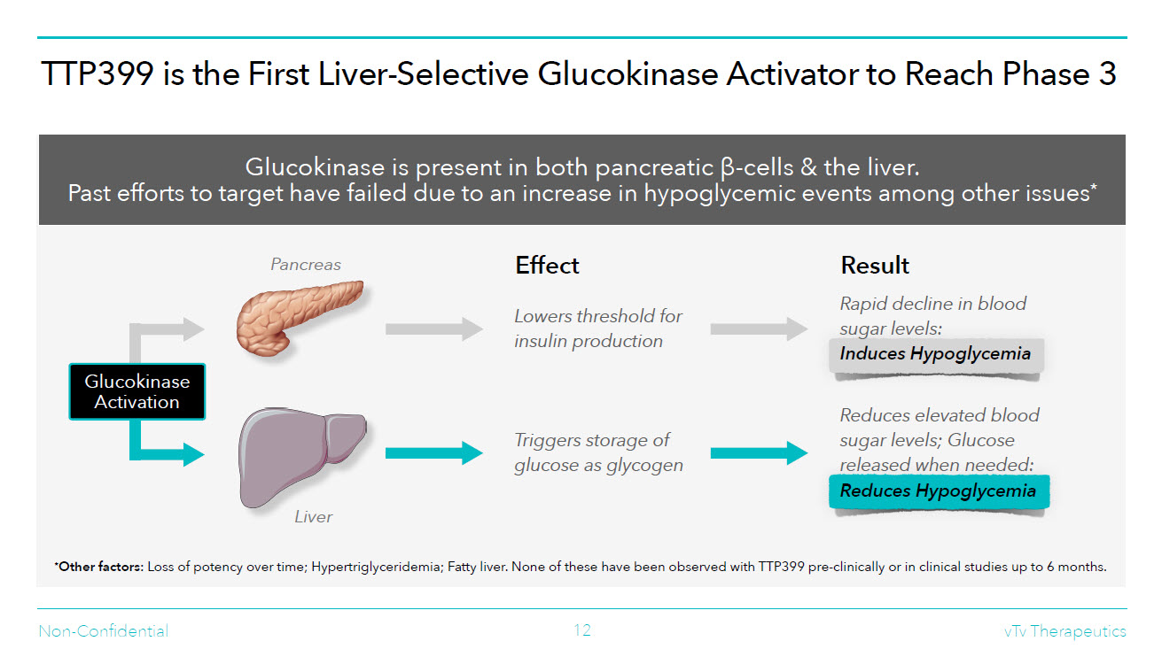 TTP399 Reactivates Innate Glucose - Regulating Capacity of the Liver TTP399 Glucokinase When blood sugar is high Glucokinase is activated despite lower insulin levels 11 Non - Confidential vTv Therapeutics When blood sugar is low Glycogen reserves available to prevent hypoglycemia Portal Vein
