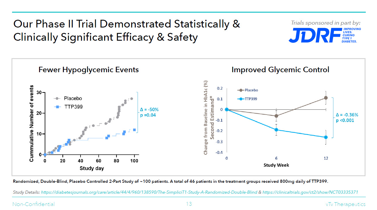 Our Phase II Trial Demonstrated Statistically & Clinically Significant Efficacy & Safety Fewer Hypoglycemic Events Improved Glycemic Control Trials sponsored in part by: 13 Non - Confidential vTv Therapeutics Randomized, Double - Blind, Placebo Controlled 2 - Part Study of ~100 patients. A total of 46 patients in the treatment groups received 800mg daily of TTP399. Study Details: https://diabetesjournals.org/care/article/44/4/960/138590/The - SimpliciT1 - Study - A - Randomized - Double - Blind & https://clinicaltrials.gov/ct2/show/NCT03335371