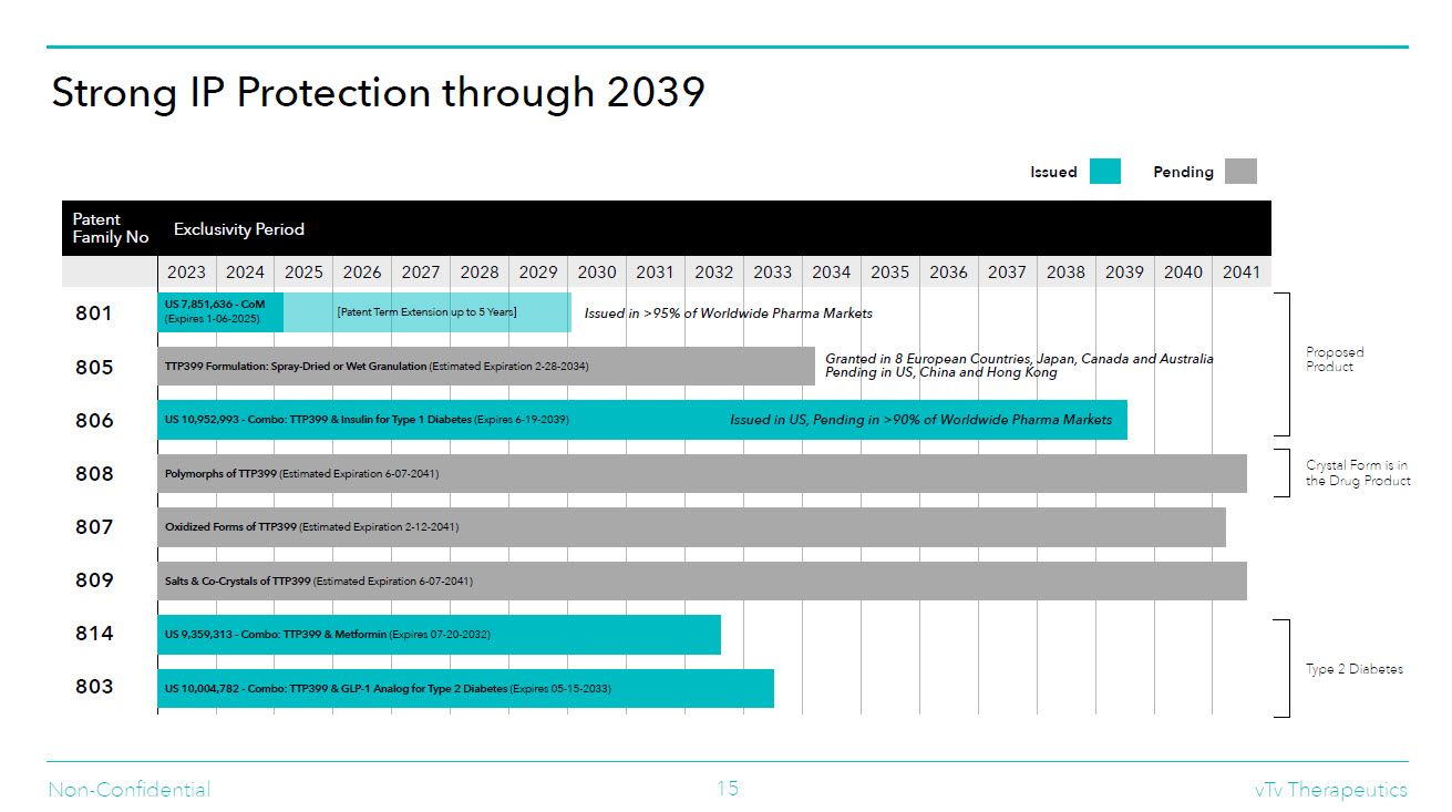 Strong IP Protection through 2039 Patent Family No Exclusivity Period 801 805 806 808 807 809 814 803 2023 2024 2025 2026 2027 2028 2029 2030 2031 2032 2033 2034 2035 2036 2037 2038 2039 2040 2041 US 7,851,636 - CoM (Expires 1 - 06 - 2025) [Patent Term Extension up to 5 Years] Issued Proposed Product TTP399 Formulation: Spray - Dried or Wet Granulation (Estimated Expiration 2 - 28 - 2034) US 10,952,993 - Combo: TTP399 & Insulin for Type 1 Diabetes (Expires 6 - 19 - 2039) Polymorphs of TTP399 (Estimated Expiration 6 - 07 - 2041) Oxidized Forms of TTP399 (Estimated Expiration 2 - 12 - 2041) Salts & Co - Crystals of TTP399 (Estimated Expiration 6 - 07 - 2041) US 9,359,313 - Combo: TTP399 & Metformin (Expires 07 - 20 - 2032) US 10,004,782 - Combo: TTP399 & GLP - 1 Analog for Type 2 Diabetes (Expires 05 - 15 - 2033) Crystal Form is in the Drug Product Type 2 Diabetes Pending 15 Non - Confidential vTv Therapeutics Issued in >95% of Worldwide Pharma Markets Issued in US, Pending in >90% of Worldwide Pharma Markets Granted in 8 European Countries, Japan, Canada and Australia Pending in US, China and Hong Kong