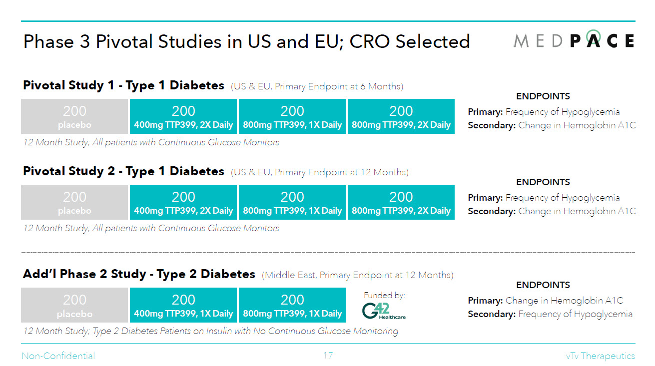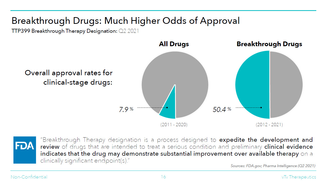 Breakthrough Drugs: Much Higher Odds of Approval Sources: FDA.gov; Pharma Intelligence (Q2 2021) (2011 - 2020) (2012 - 2021) “Breakthrough Therapy designation is a process designed to expedite the development and review of drugs that are intended to treat a serious condition and preliminary clinical evidence indicates that the drug may demonstrate substantial improvement over available therapy on a clinically significant endpoint(s) . ” TTP399 Breakthrough Therapy Designation: Q2 2021 All Drugs Breakthrough Drugs 16 Non - Confidential vTv Therapeutics Overall approval rates for clinical - stage drugs: 7.9 % 50.4 %